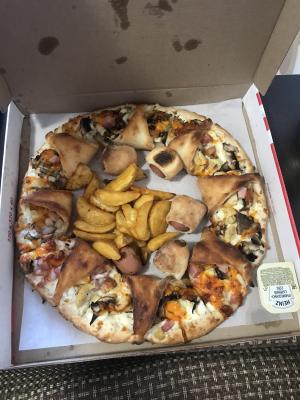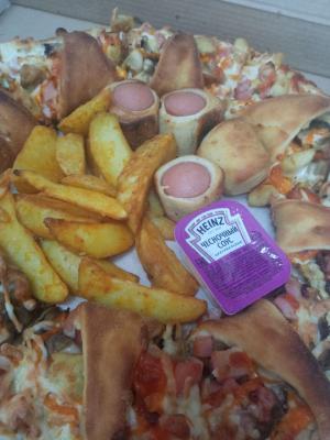 Состав: сыр, курица, грибы жареные, бекон, соус ранч, сосиски "Хот", чеддер, картофель по-деревенски