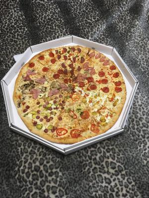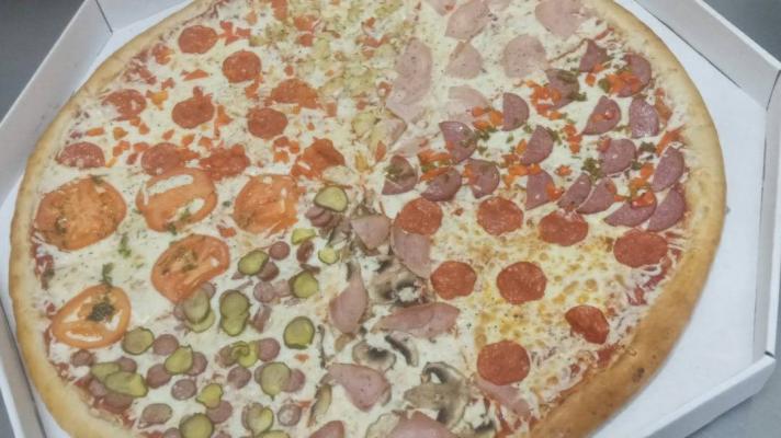 - мега-пицца "Восемь ломтиков" (60 см, 2000 г): моцарелла, ветчина, грибы, колбаски охотничьи, огурец, курица, помидор, пепперони, перец сладкий, салями, перец халапеньо