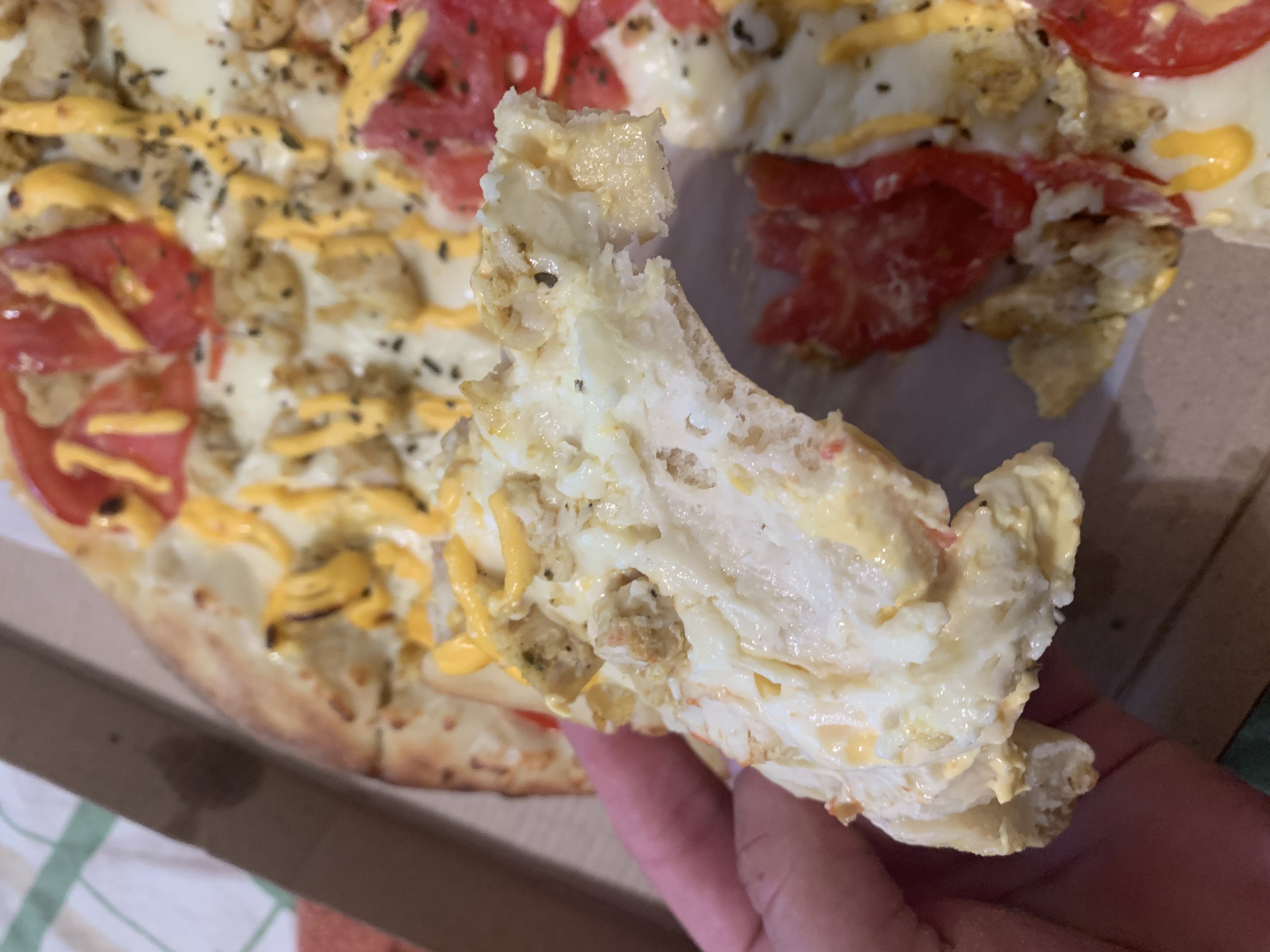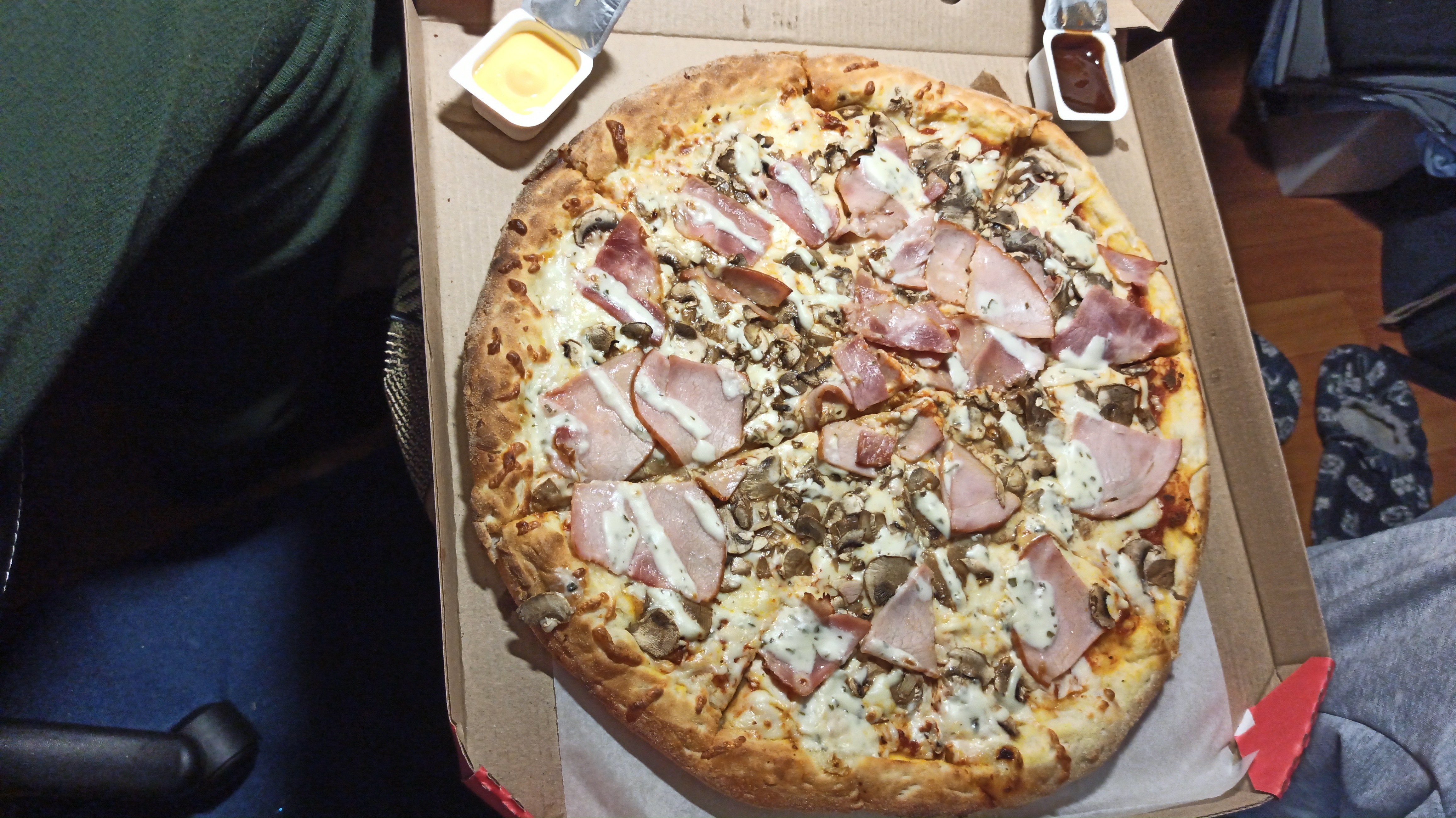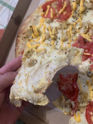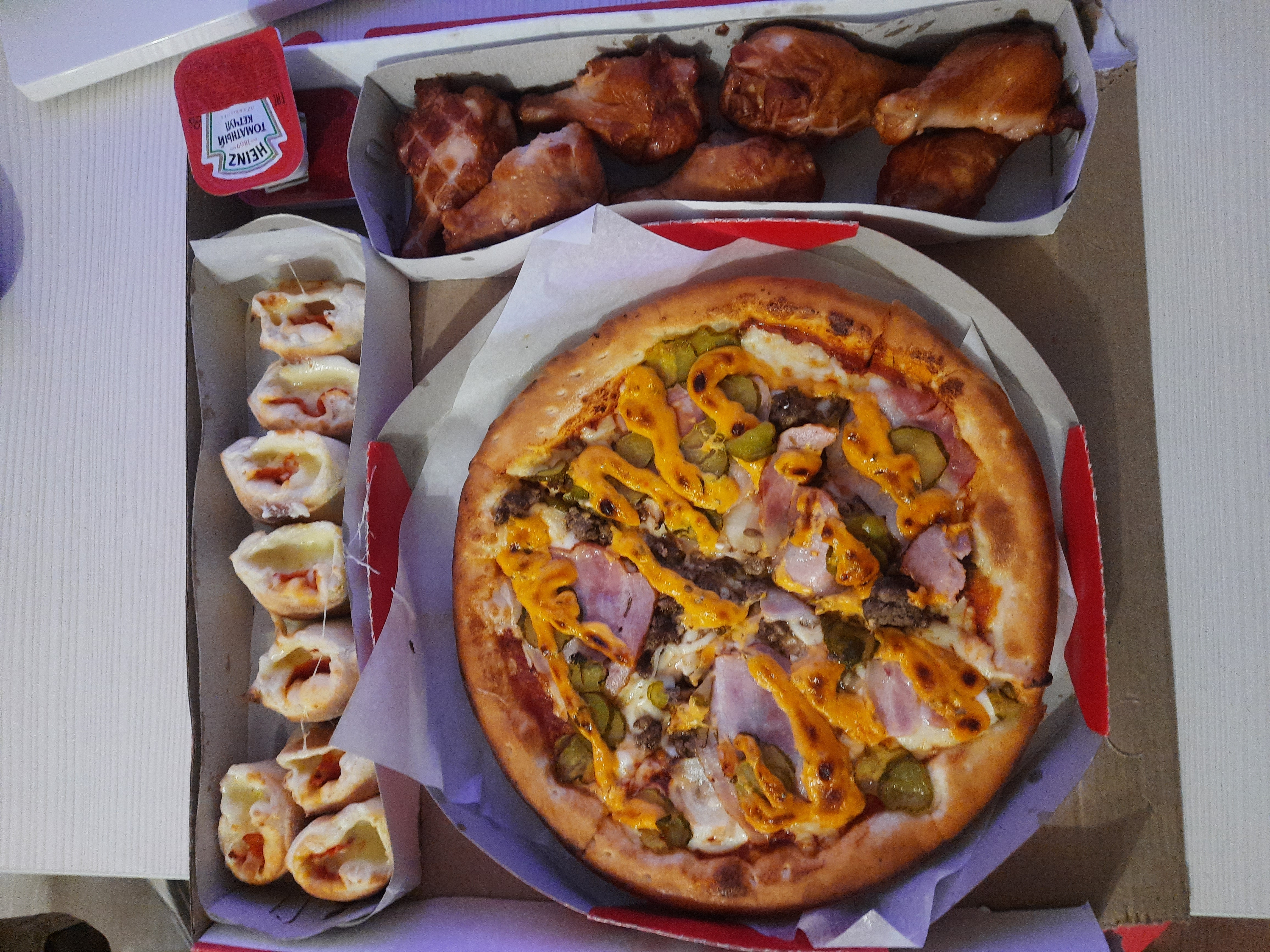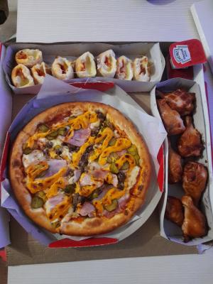 Состав: моцарелла, чесночный соус, кетчуп, ветчина, грибы, пепперони, курица, томат, фета