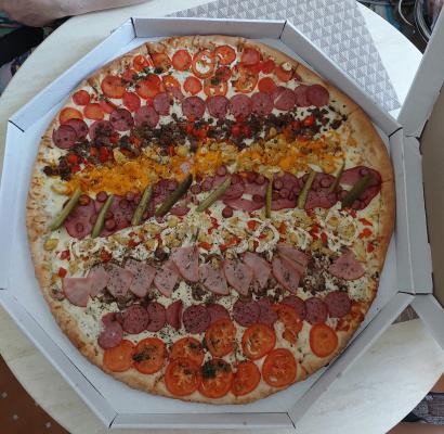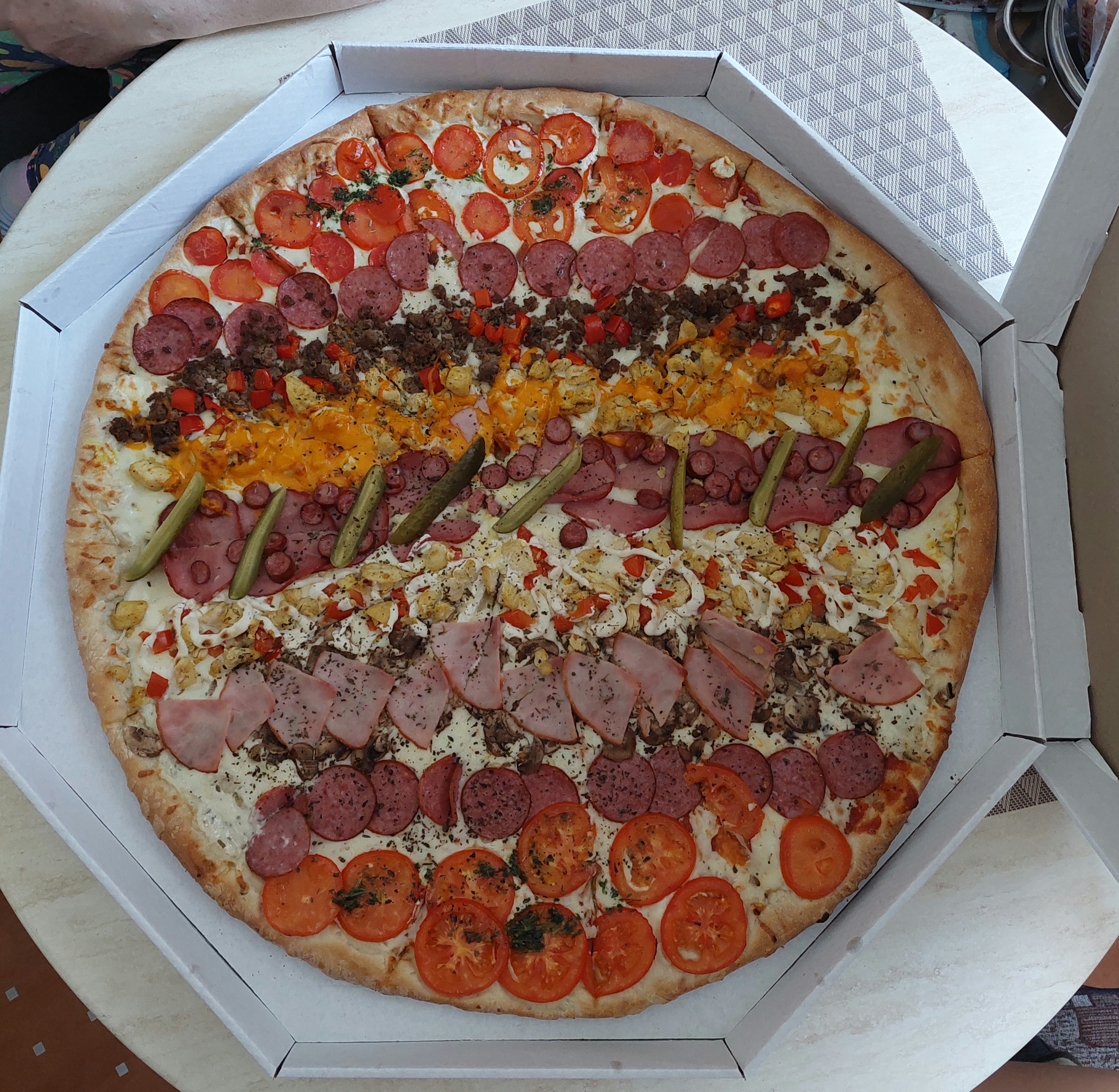 - мега-пицца "Восемь ломтиков" (60 см, 2000 г): моцарелла, ветчина, грибы, колбаски охотничьи, огурец, курица, помидор, пепперони, перец сладкий, салями, перец халапеньо
