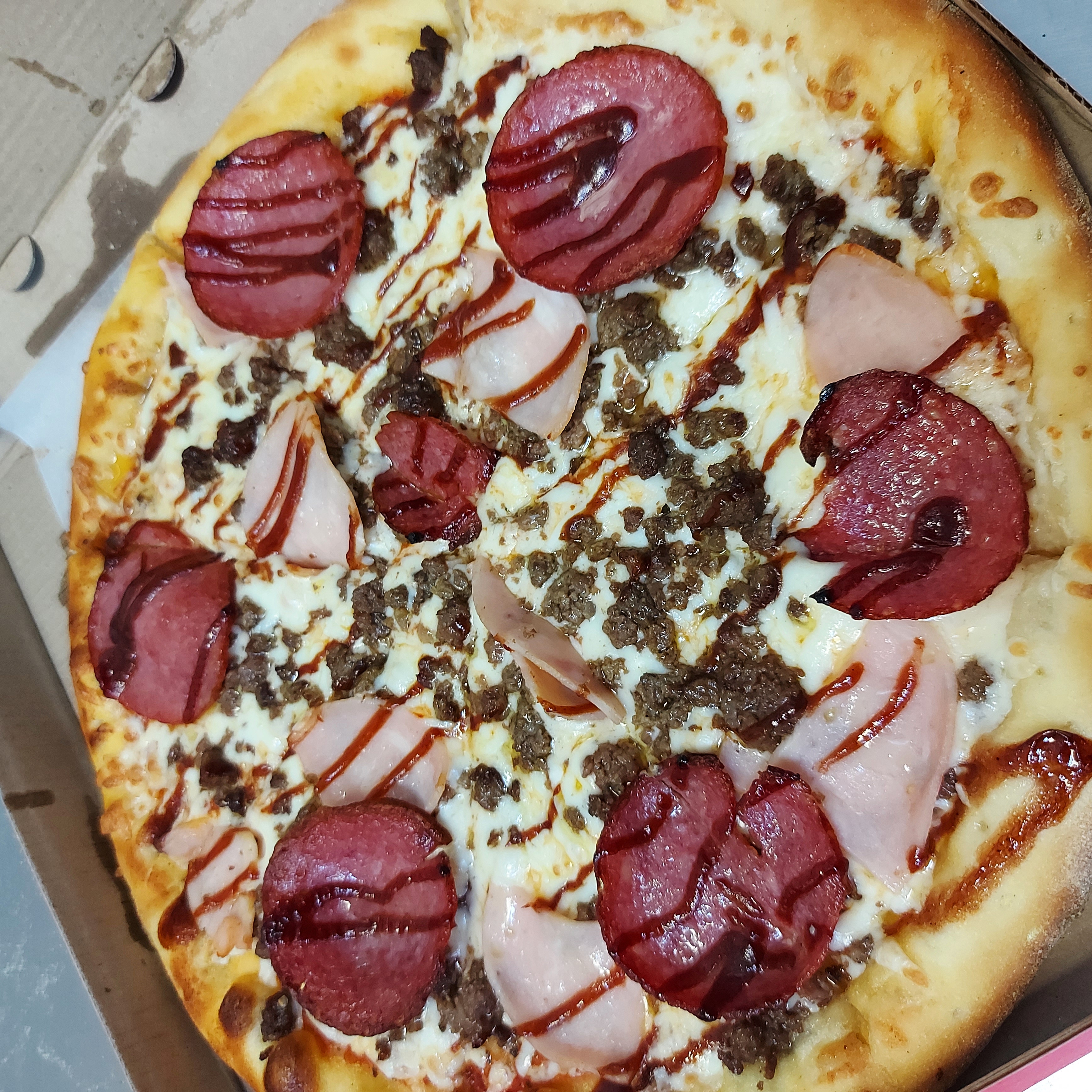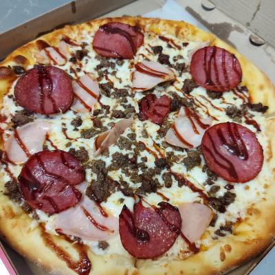Состав: пицца-соус, моцарелла, колбаски охотничьи, пепперони, салями, курица, бекон, помидор, огурец маринованный, соус горчичный, соус барбекю, лук маринованный, сыр чеддер