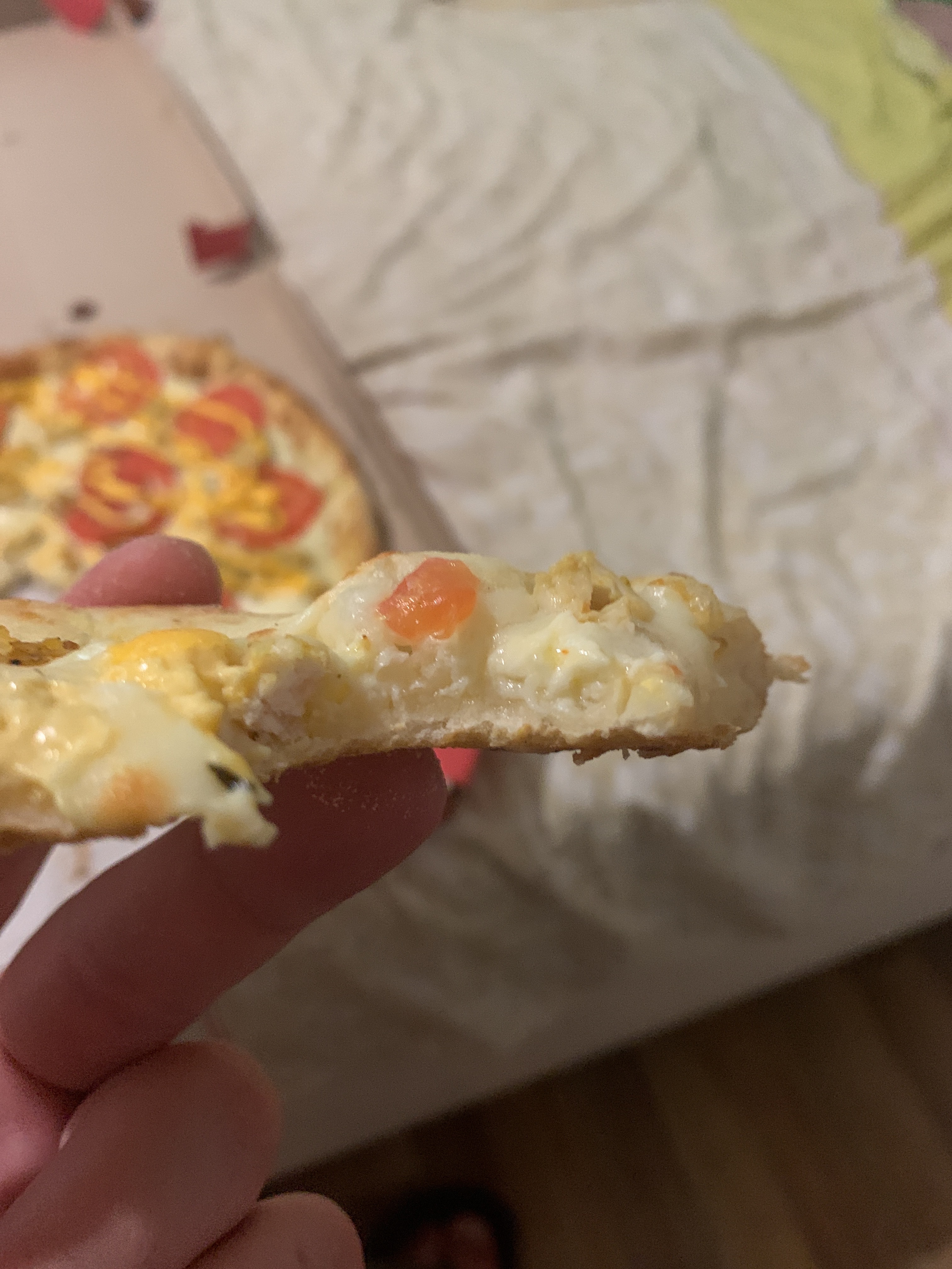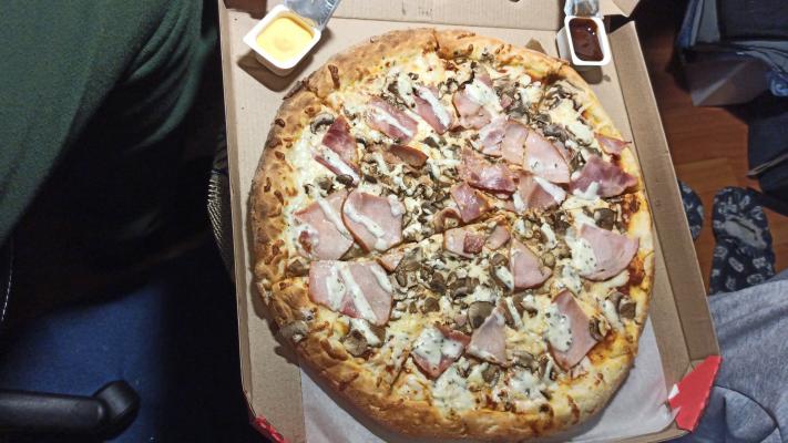 Состав: моцарелла, пицца-соус, ветчина, бекон, томат, огурец маринованный, чеддер, соус бургер