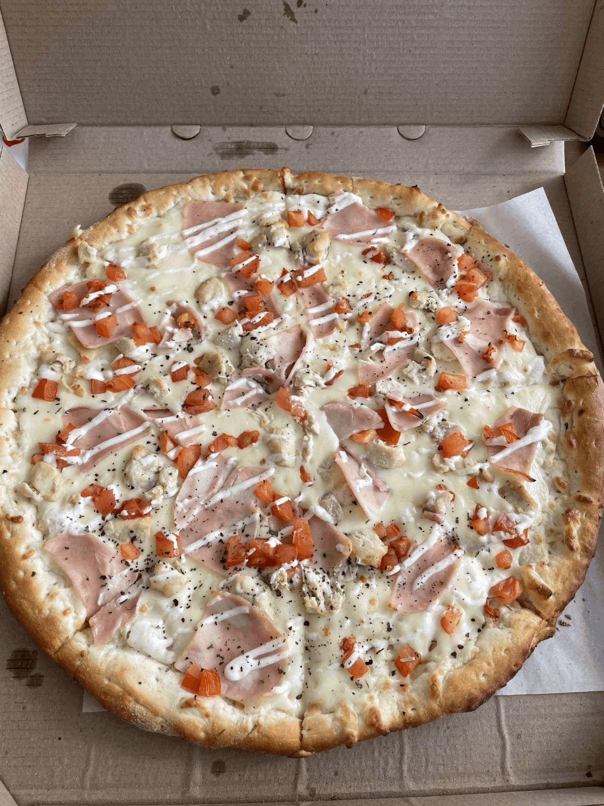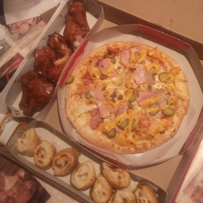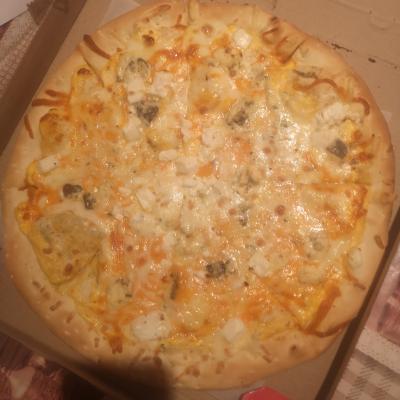 Состав: моцарелла, чесночный соус, кетчуп, ветчина, грибы, пепперони, курица, томат, фета