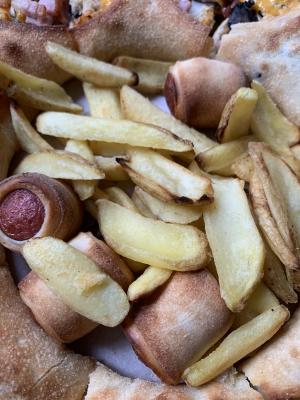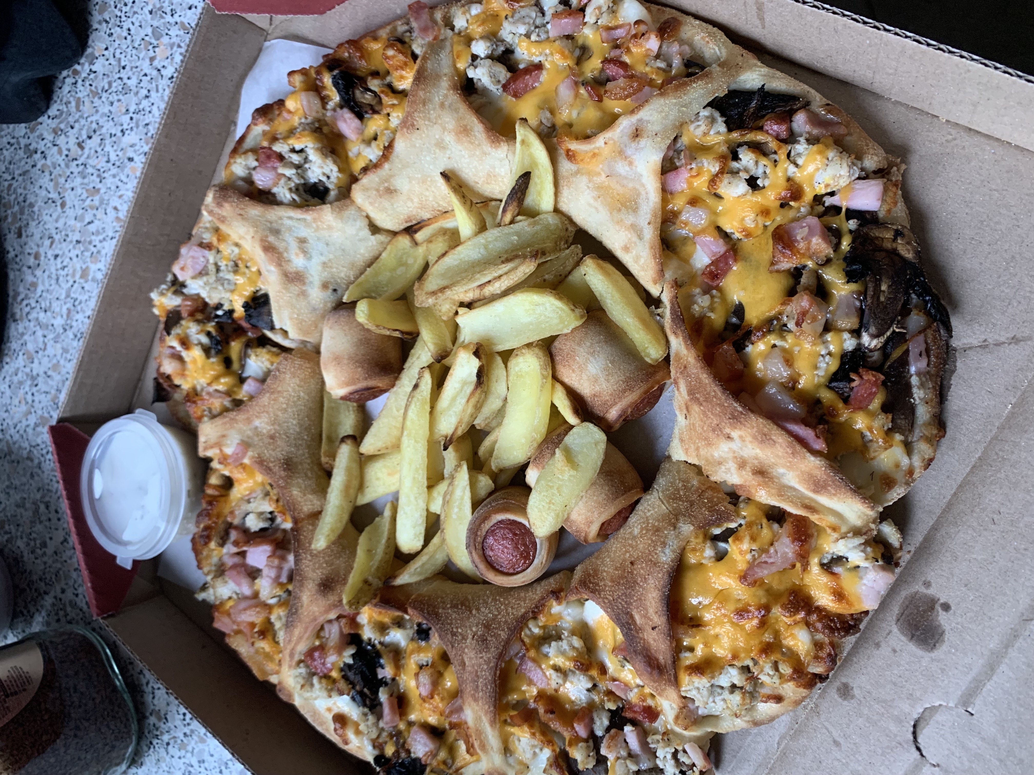 Состав: сыр, курица, грибы жареные, бекон, соус ранч, сосиски "Хот", чеддер, картофель по-деревенски