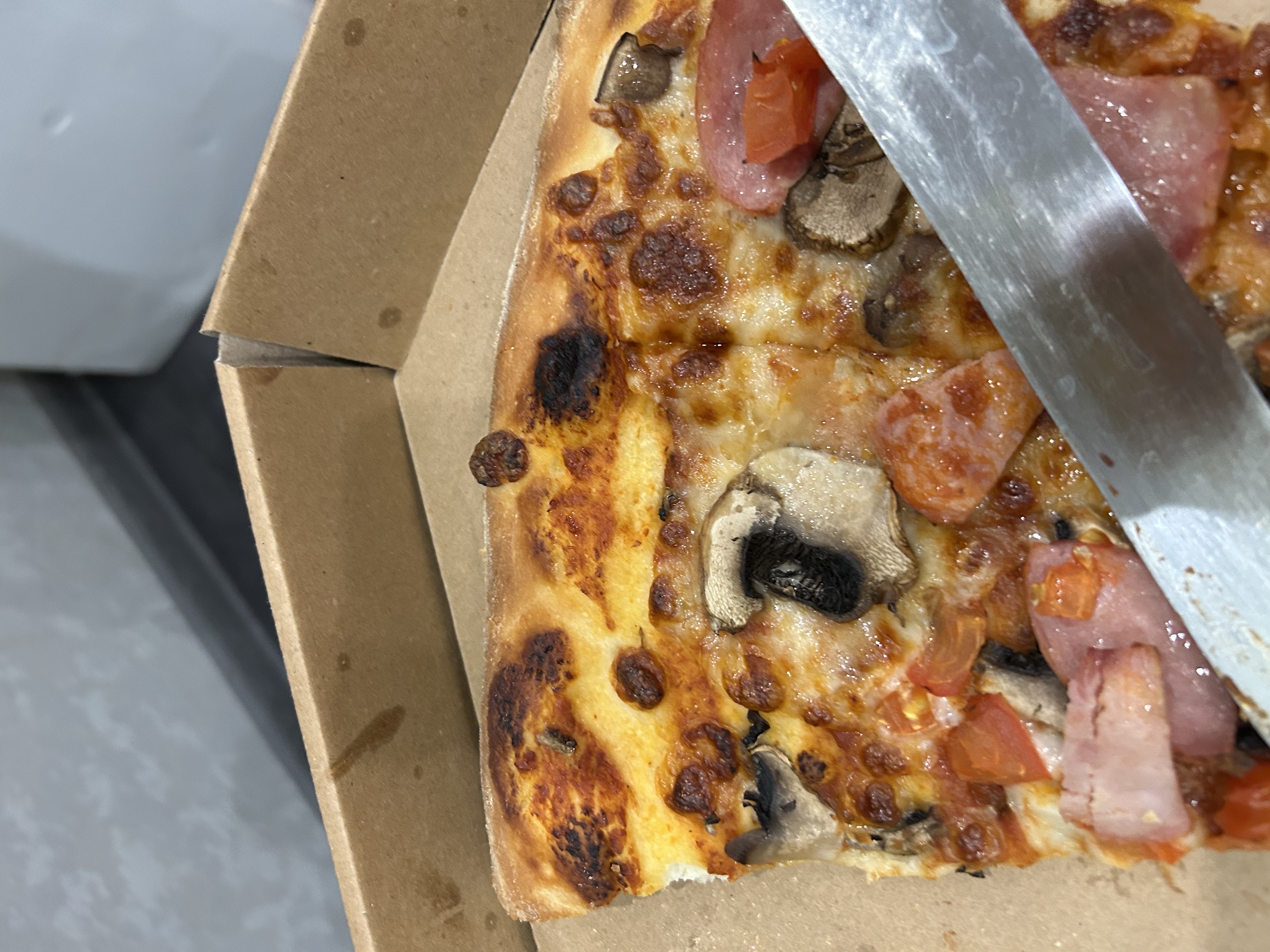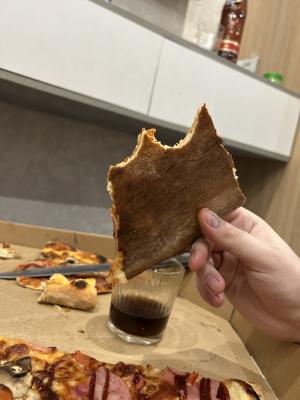 Состав: моцарелла, пицца-соус, ветчина, бекон, томат, огурец маринованный, чеддер, соус бургер