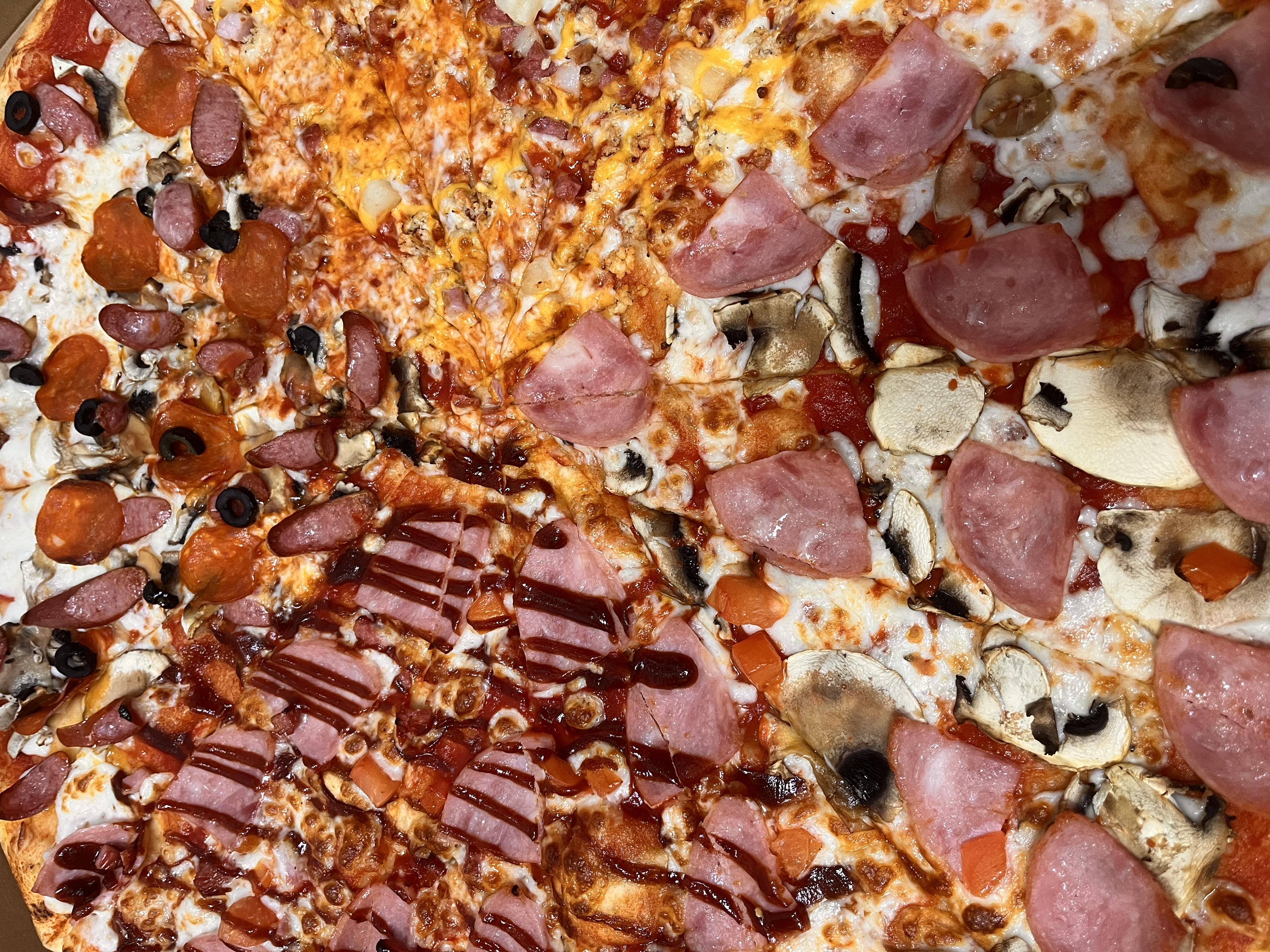 - мега-пицца "Мясная" (60 см, 2000 г): моцарелла, пицца-соус, бекон, пепперони, курица, томат, грибы, ветчина куриная, колбаски охотничьи, огурец маринованный, соус (ранч, горчичный, барбекю)