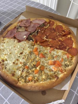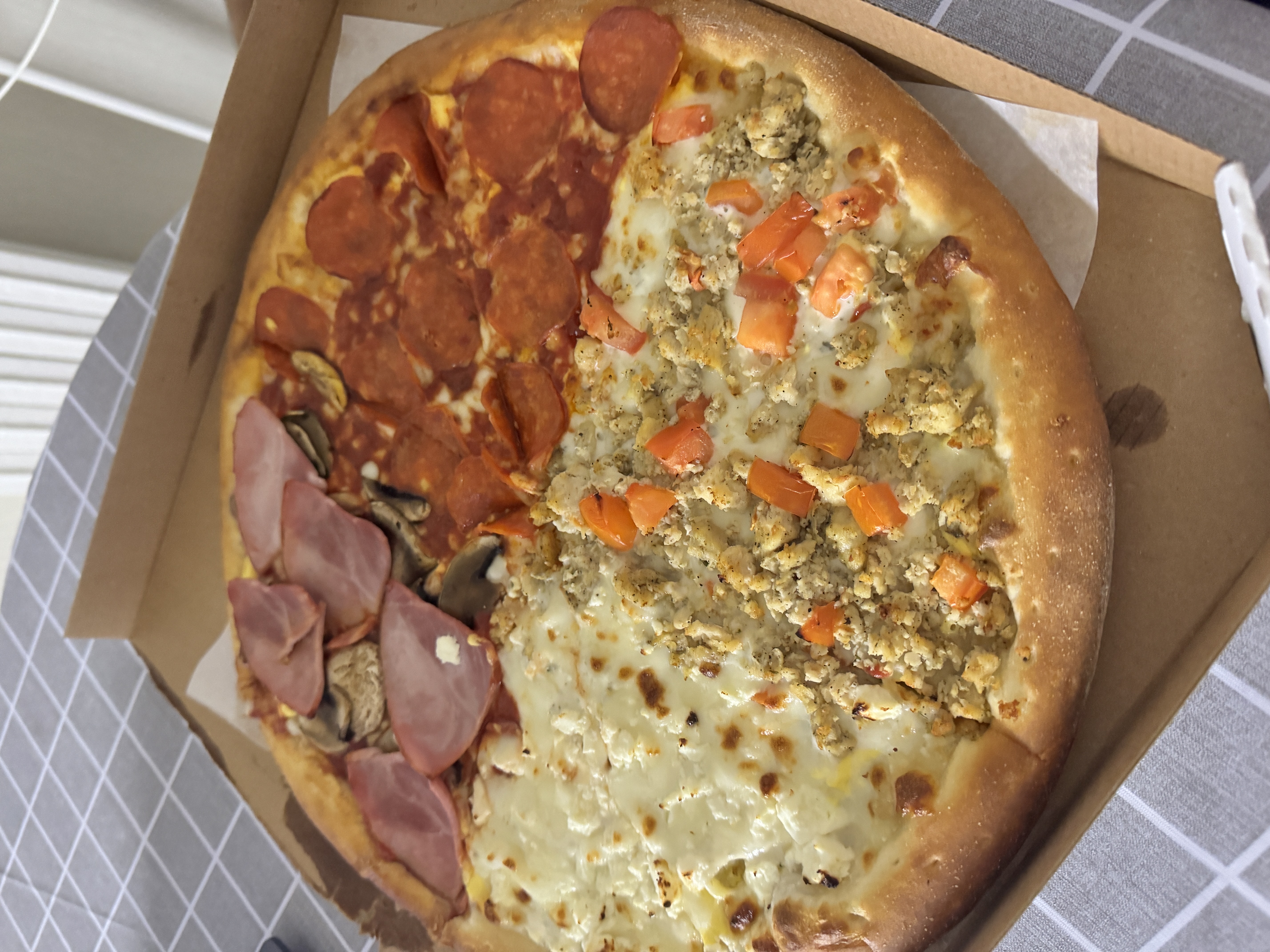 Состав: моцарелла, чесночный соус, кетчуп, ветчина, грибы, пепперони, курица, томат, фета