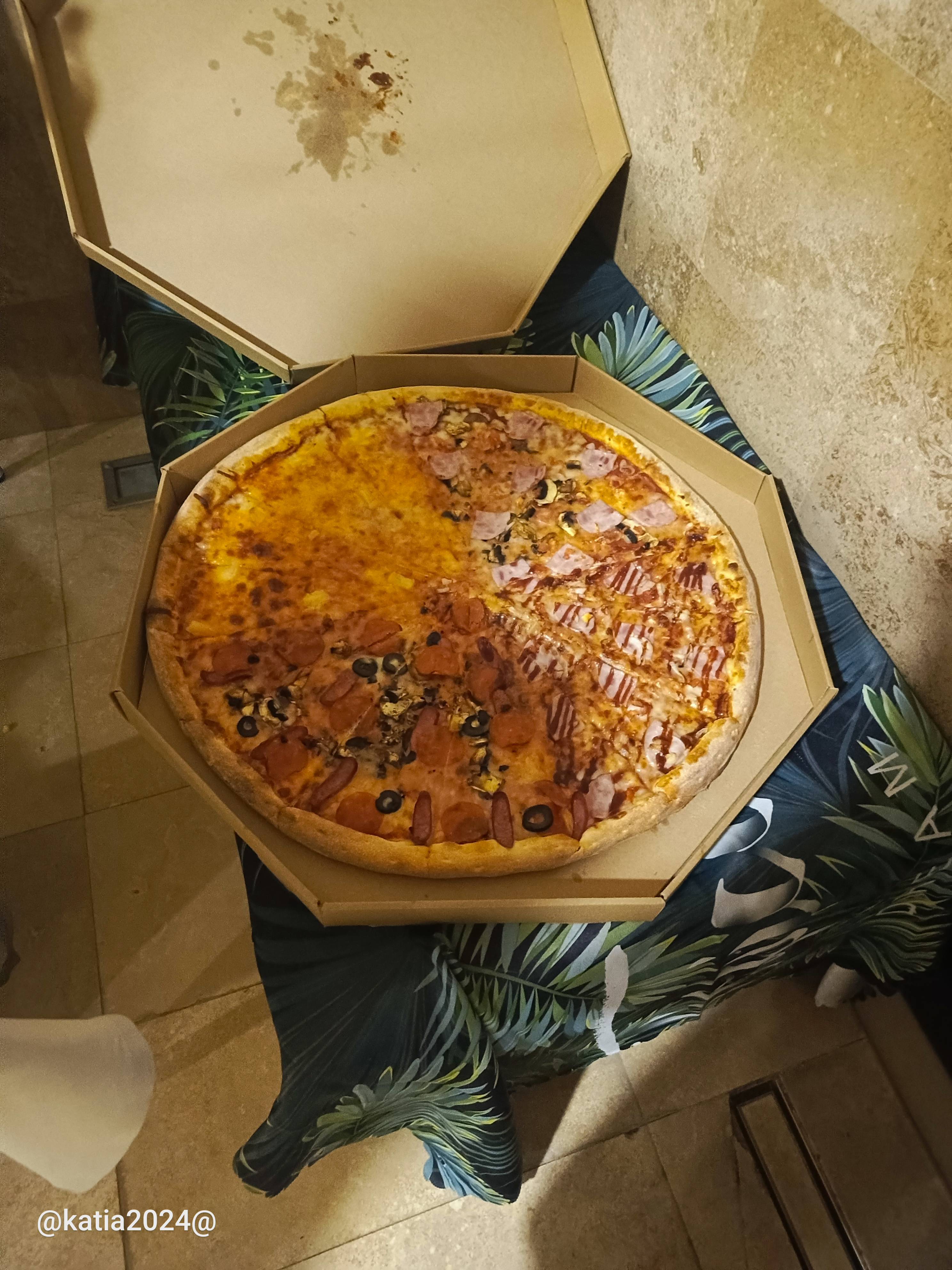 Состав: пицца-соус, моцарелла, бекон, куриная ветчина, колбаски охотничьи, салями, пепперони, помидор, огурец маринованный, маслины, соус бургер