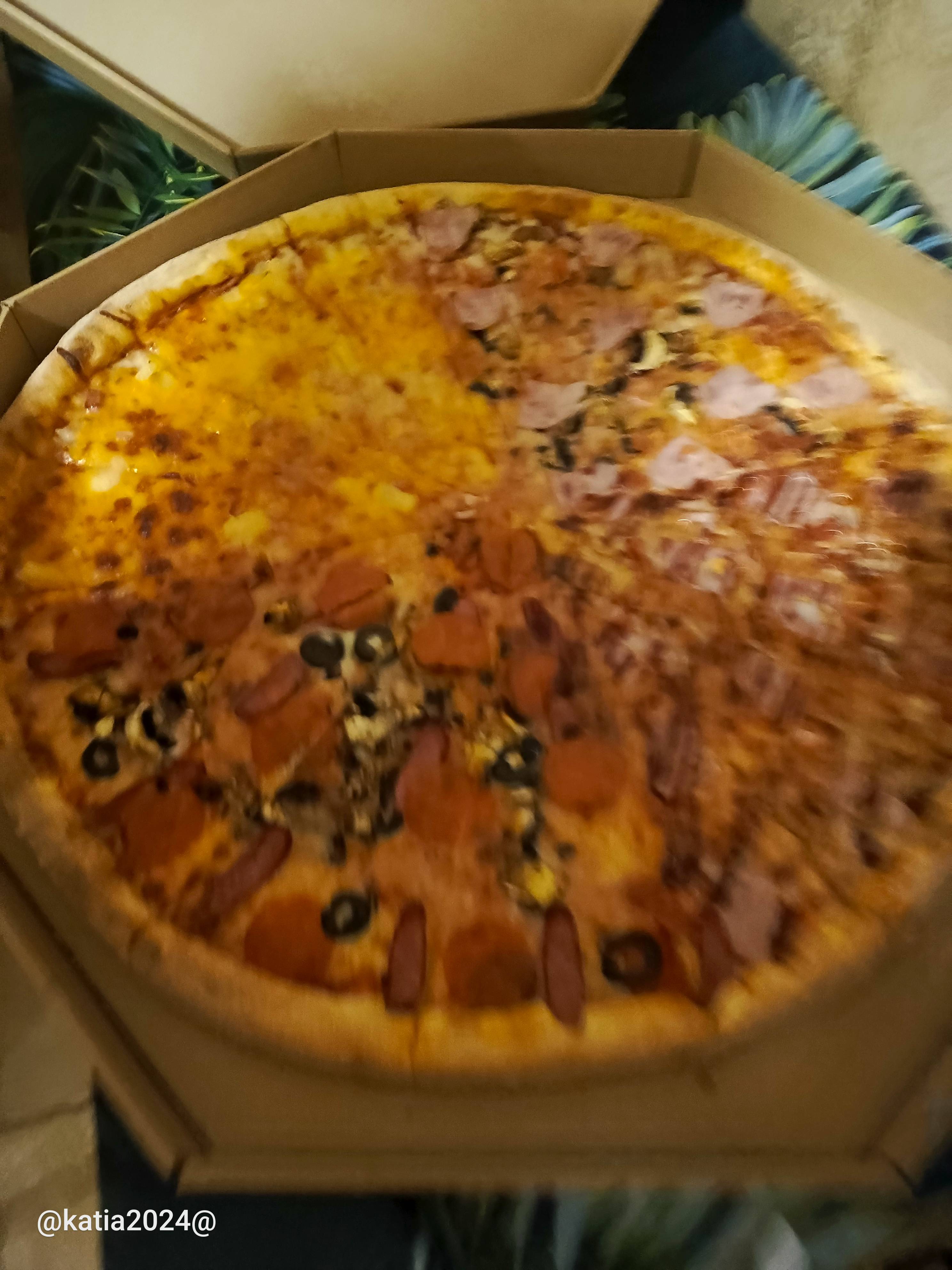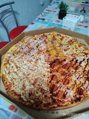 - мега-пицца "Восемь ломтиков" (60 см, 2000 г): моцарелла, ветчина, грибы, колбаски охотничьи, огурец, курица, помидор, пепперони, перец сладкий, салями, перец халапеньо
