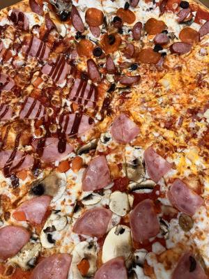 - мега-пицца "Компанейская" (60 см, 2000 г): моцарелла, пицца-соус, помидор, ветчина куриная, пепперони, бекон, лук маринованный, колбаски охотничьи, огурцы маринованные