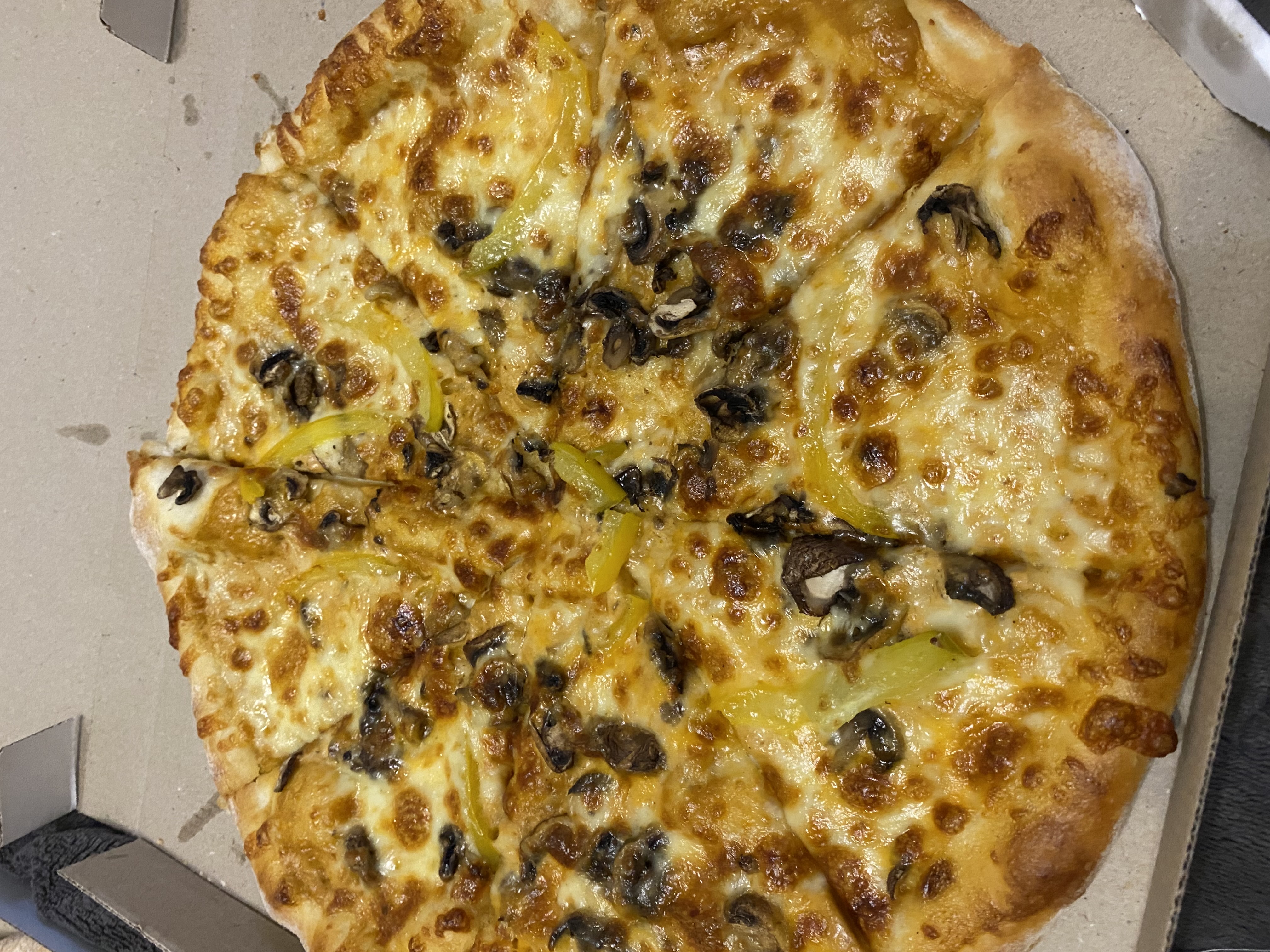 Состав: тесто, соус грибной, шампиньоны, сырная смесь, меланж яичный