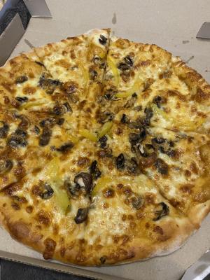 - пицца "Гавайская с курицей" (645 г): тесто, курица (шаурма), соус пикантный, ананас консервированный, томаты вяленые, меланж яичный, соус чили сладкий, сырная смесь