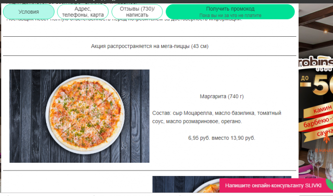 - Промокод дает право на скидку 40% на мега-пиццы (43 см) навынос и в кафе "GARAGE"