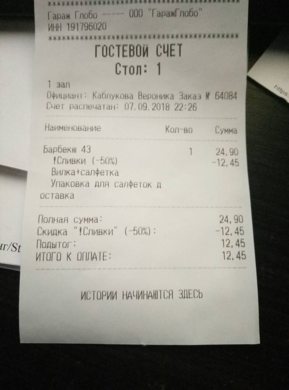 - Для получения скидки в зале кафе необходимо зарегистрировать чек в мобильном приложении "GARAGE", промокод необходимо указывать в строке "промокод" или сообщить официанту до оформления счета