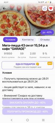 - Промокод дает право на скидку 40% на мега-пиццы (43 см) навынос и в кафе "GARAGE"