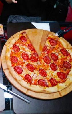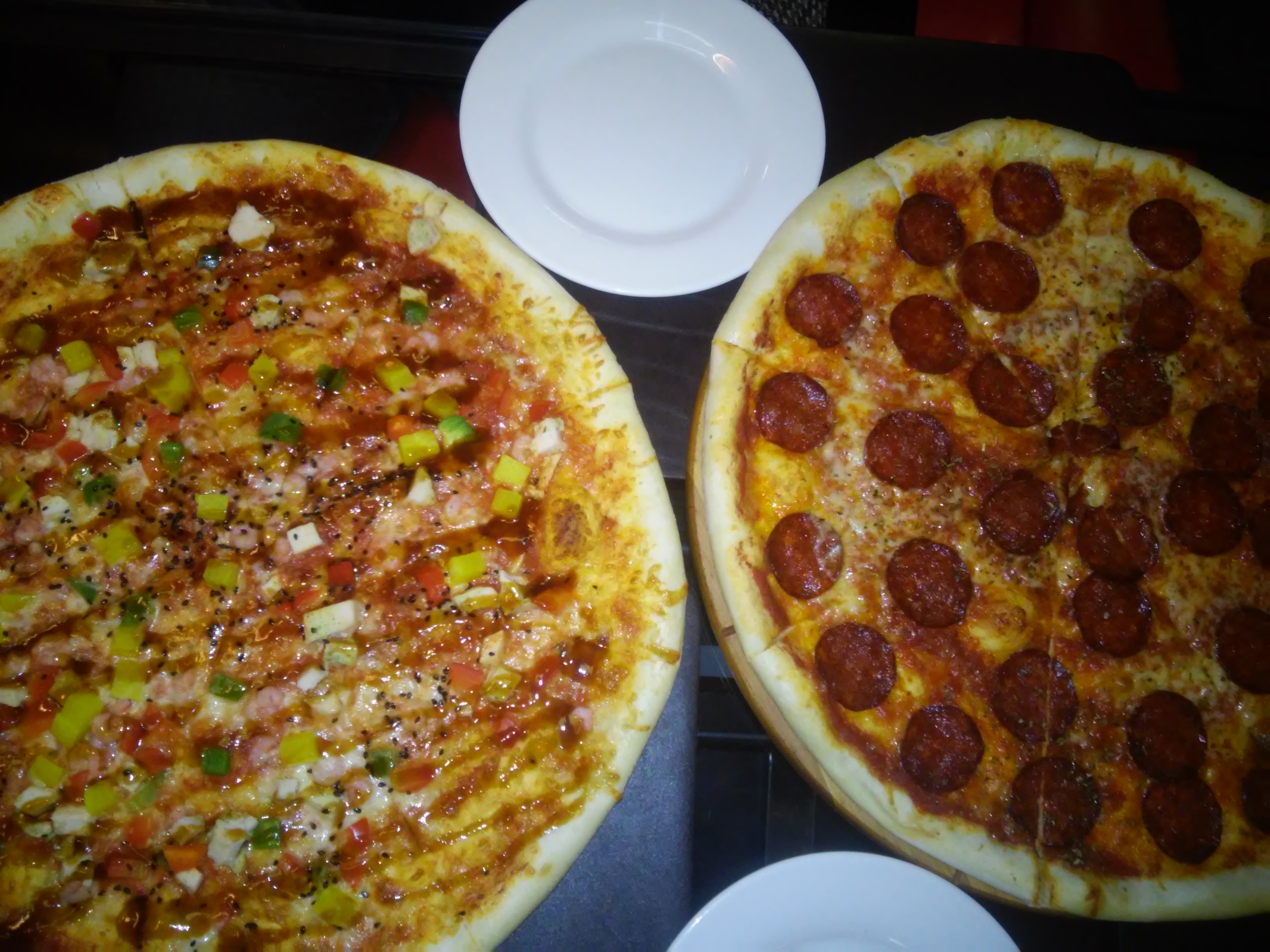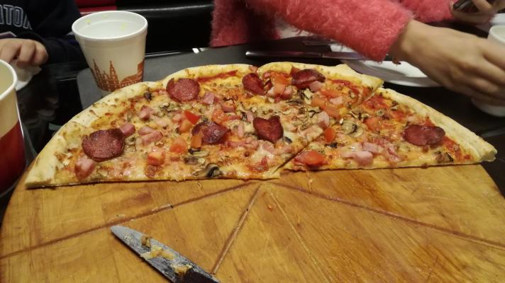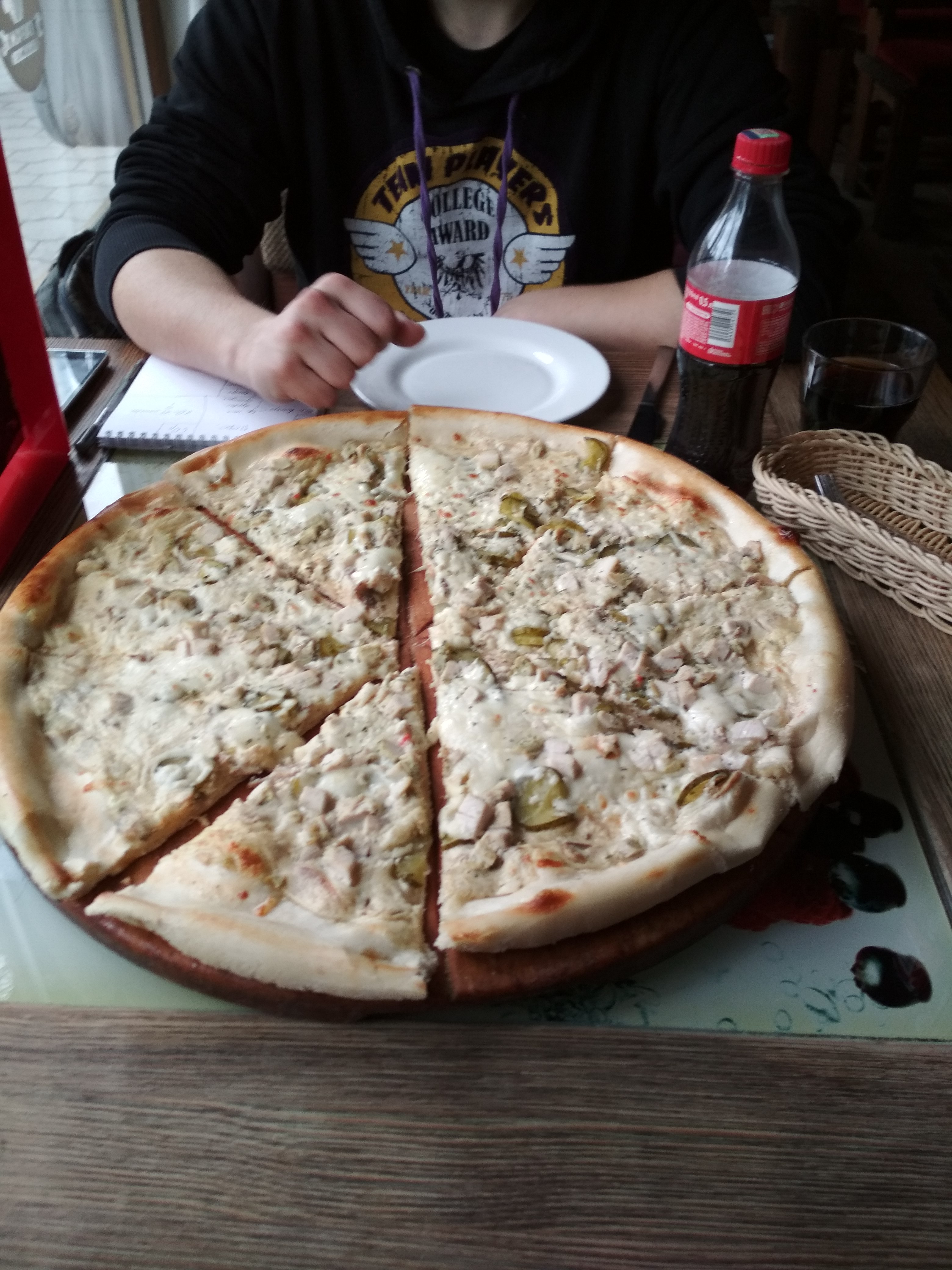 Клёвая здоровенная и горячая пицца. Вдвоем объелись)