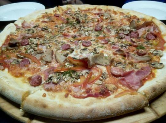 Заказывали пиццу на детский праздник. Пиццы действительно очень сытные и большие, заказ был готов в срок. Брали разные (с ветчиной и грибами; с ветчиной, томатами и шампиньонами; с ветчиной, курицей и шампиньонами; 4 сыра с рукколой; шеф-пицца, гаражная) все пиццы понравились. Дети и взрослые наелись и остались довольны.