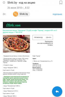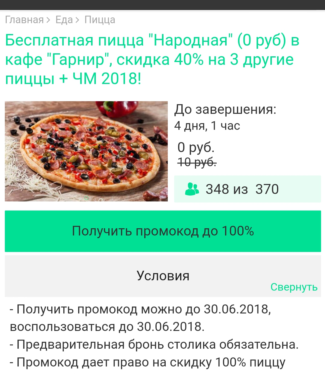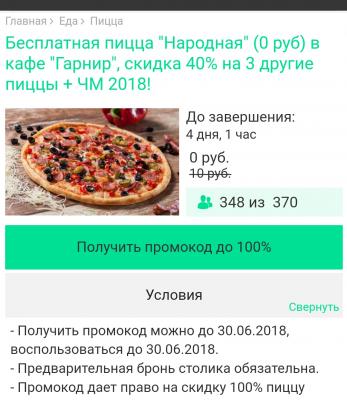 - Промокод дает право на скидку 50% на две большие пиццы "Цезарь" и "Народная" в кафе "Гарнир".