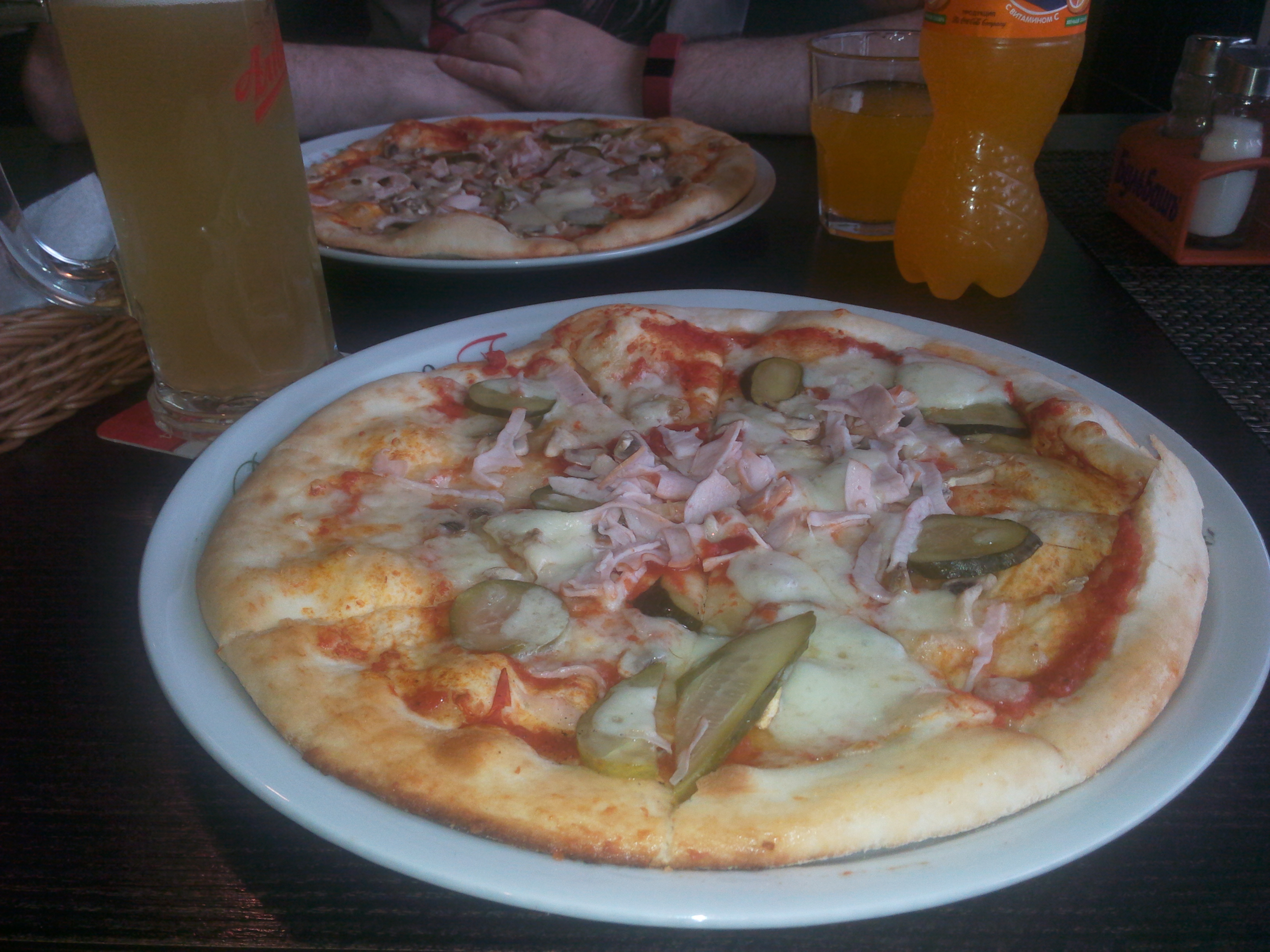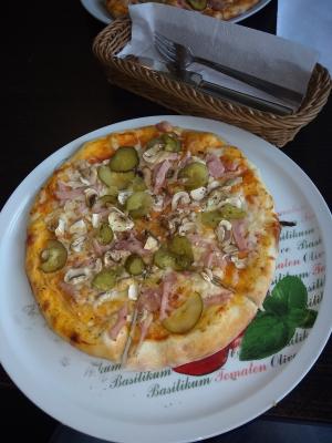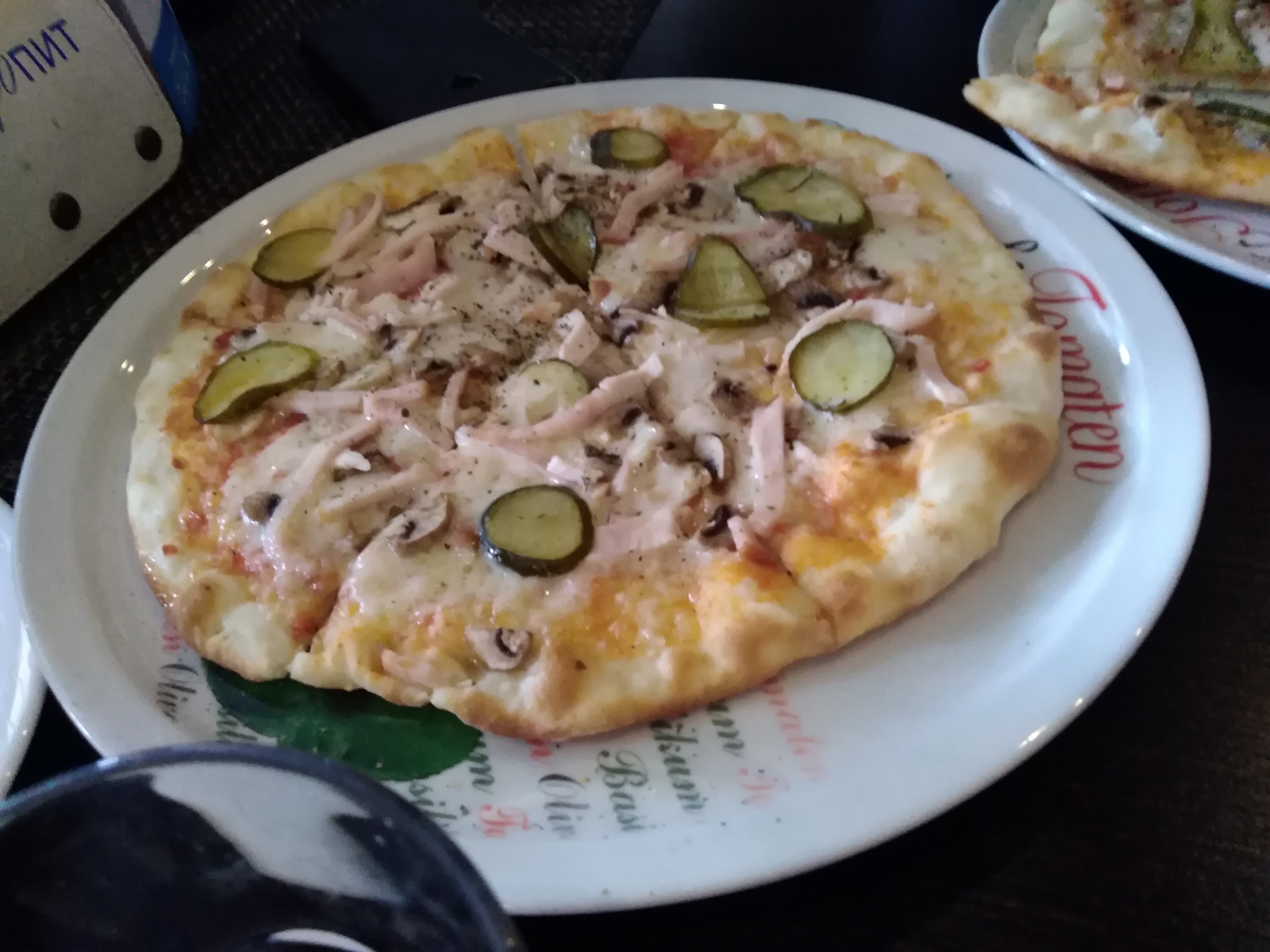 соус пилати, сыр моцарелла, ветчина, шампиньоны, огурец маринованный