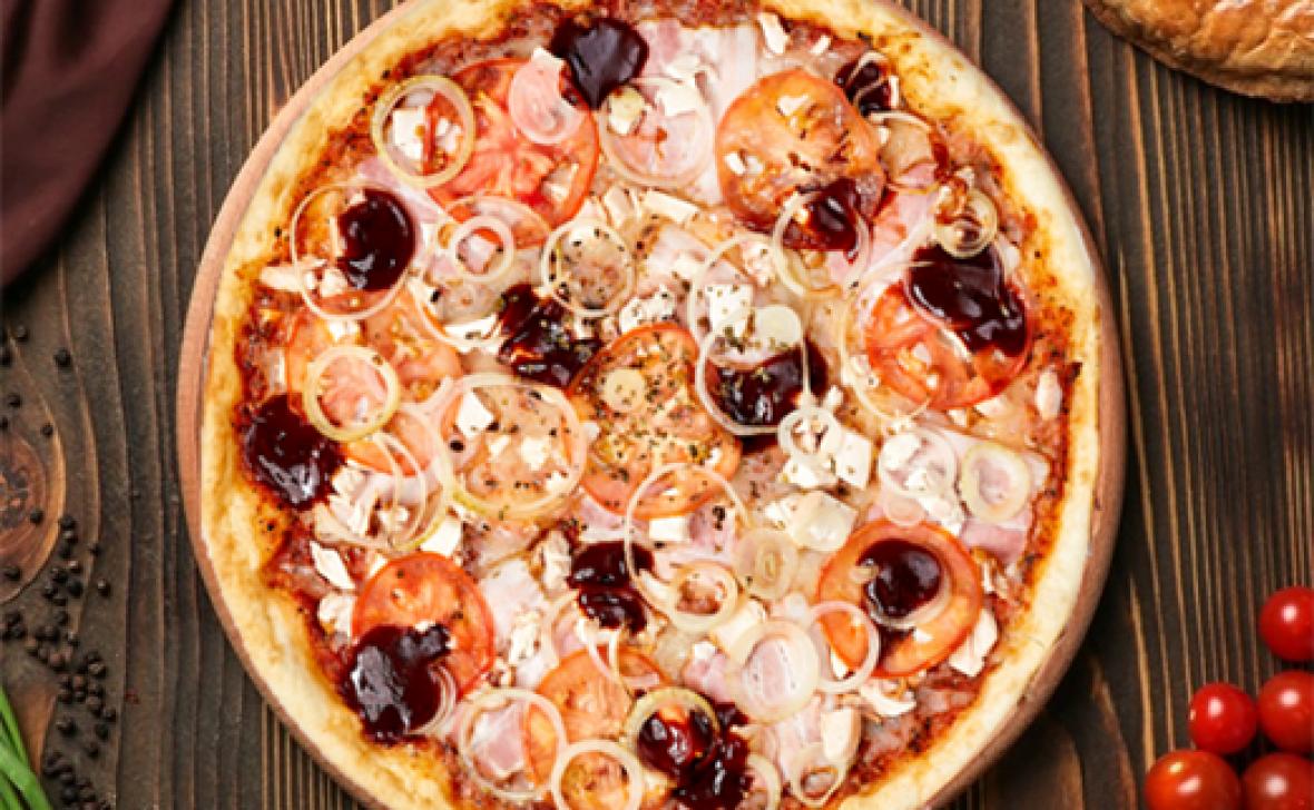 - пицца "Чикен BBQ" (30 см, 525 г): пицца-соус, куриное филе, бекон, томаты свежие, маринованный красный лук, соус барбекю
