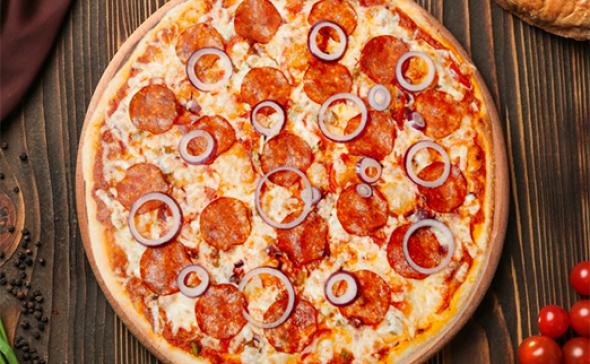 - пицца "Баварская" (30 см, 525 г): пицца-соус, баварские колбаски, красный лук, сыр моцарелла