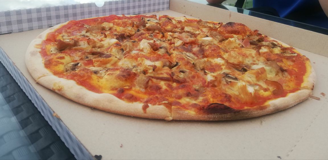 Состав: соус томатный, сыр моцарелла, шампиньоны, ветчина, орегано