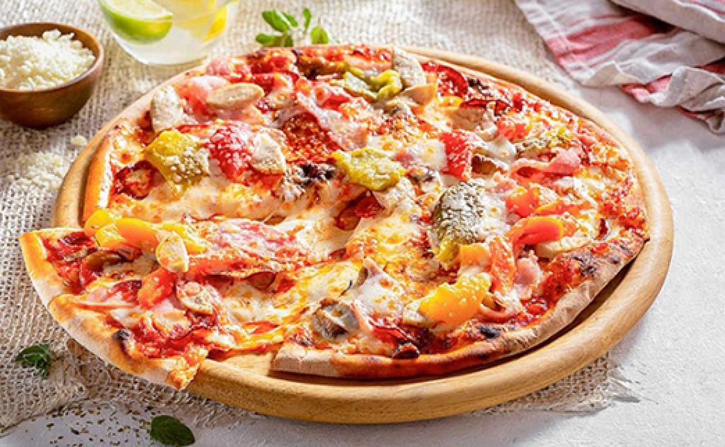 Состав: сыр моцарелла, ветчина,шампиньоны, колбаска пепперони, бекон, перец сладкий |