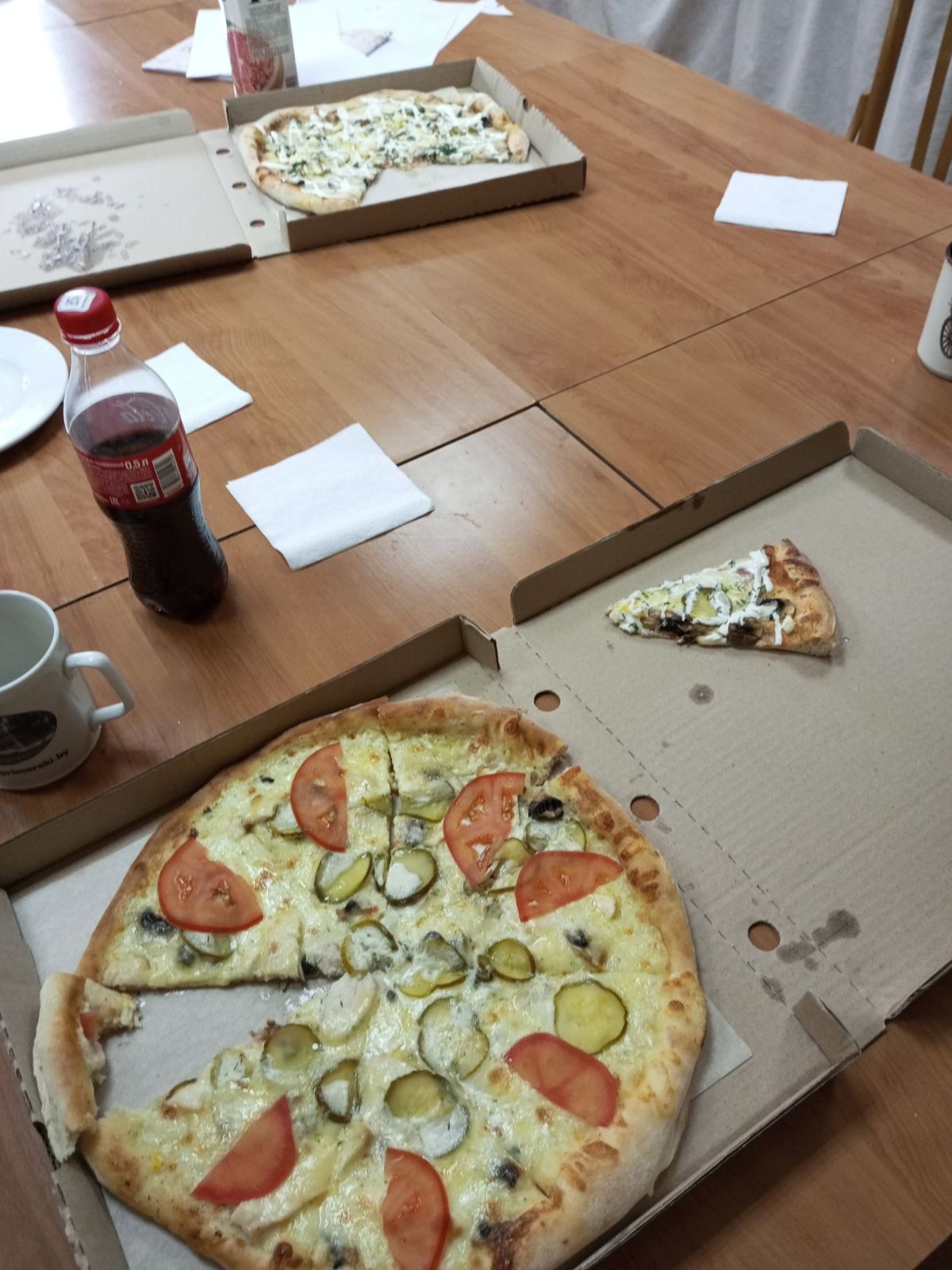Состав: тесто, помидорная смесь, сыр чеддер, бекон, балык, огурцы маринованные, соус рикотта, соус чесночный, порей