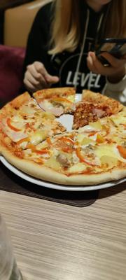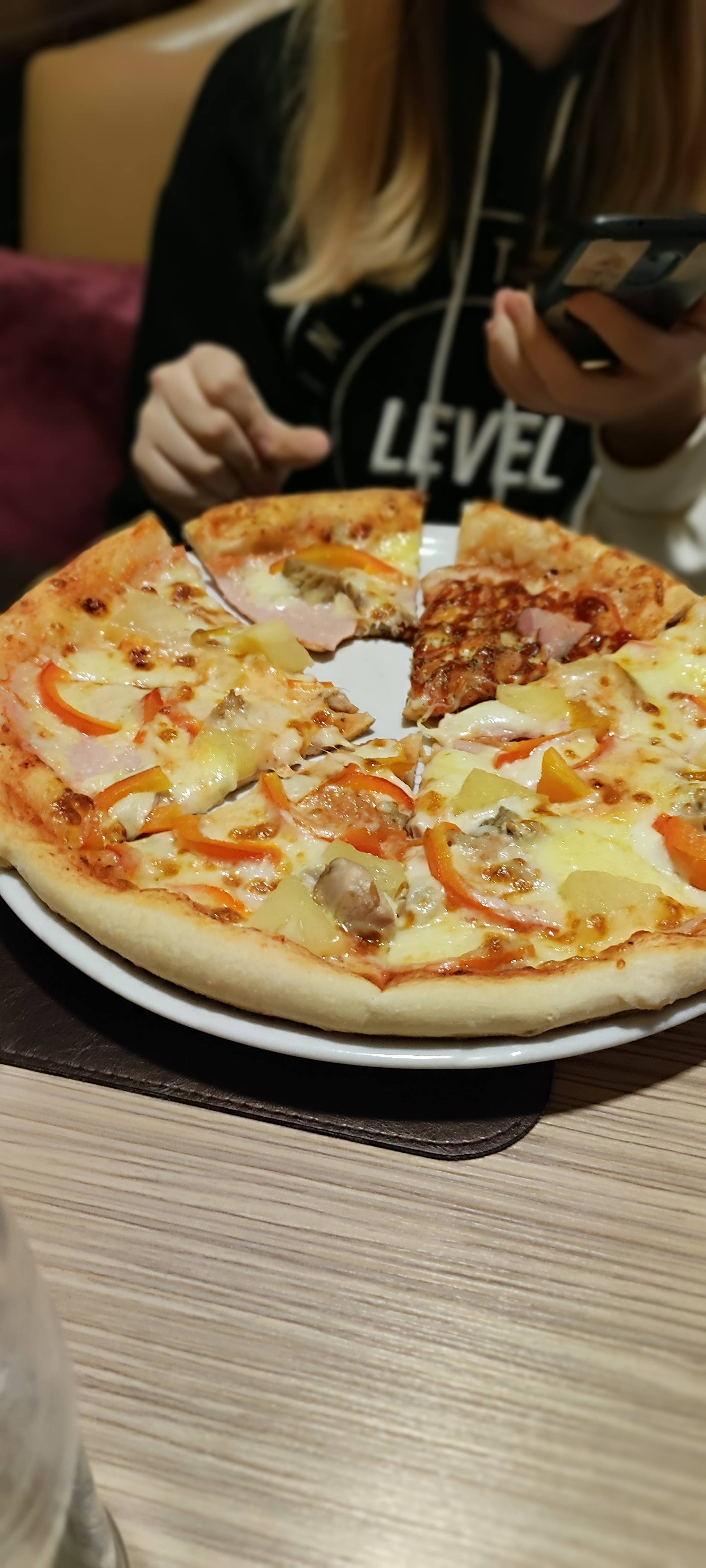 Состав: тесто, помидорная смесь, моцарелла, курица, ветчина, консервированные ананас, перец сладкий, специи