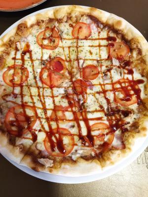 Состав: тесто, помидорная смесь, моцарелла, бекон, курица, соус барбекю, томаты, масло чесночное, специи