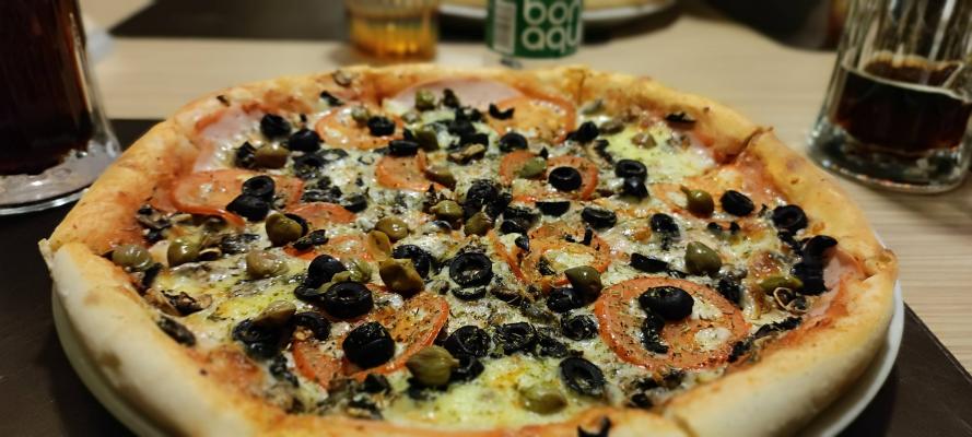 Состав: тесто, помидорная смесь, ветчина, салями, моцарелла, маслины, специи
