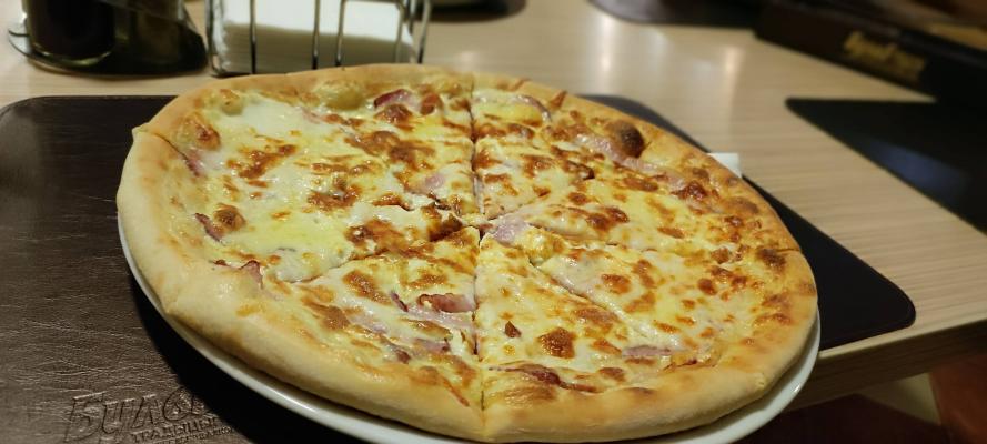 Состав: тесто, соус карбонара, моцарелла, бекон, балык
