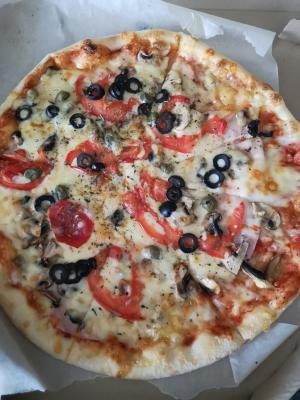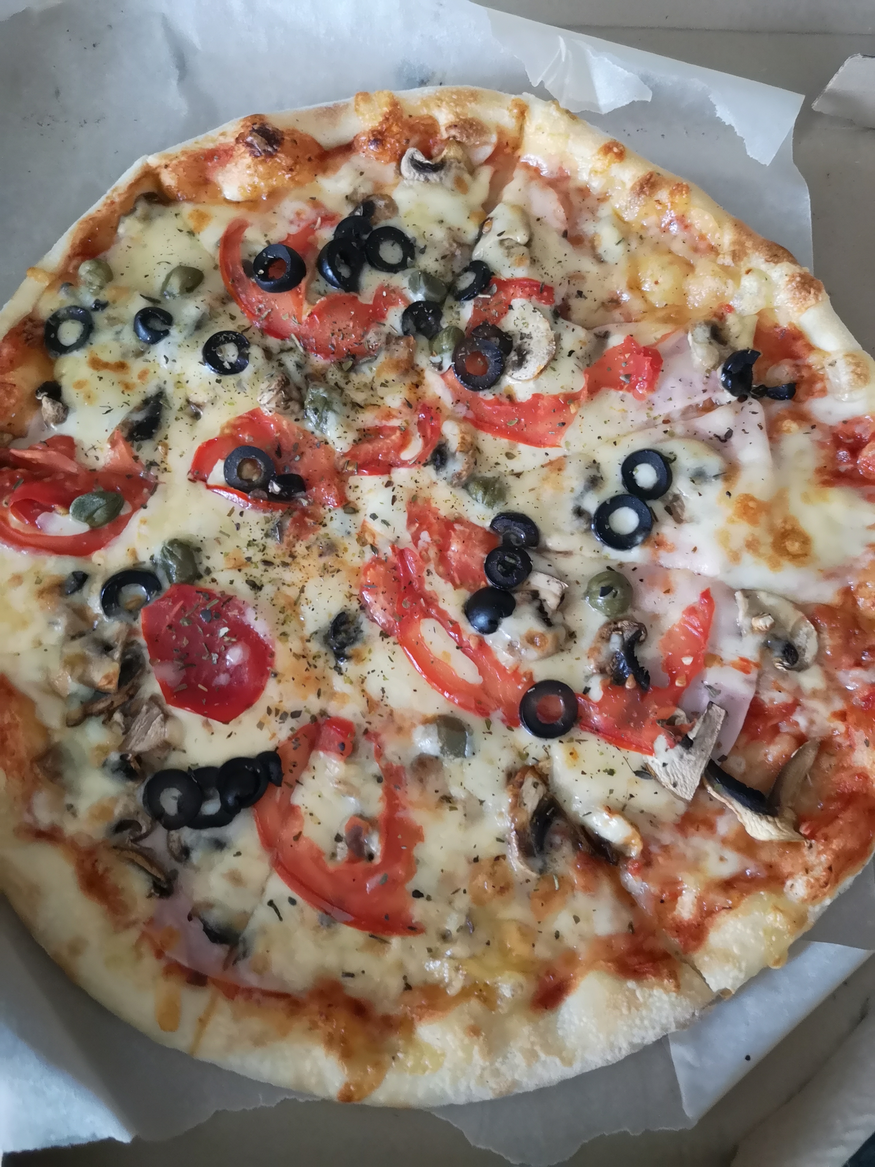 Состав: тесто, помидорная смесь, моцарелла, ветчина, шампиньоны, маслины, каперсы, томаты, специи