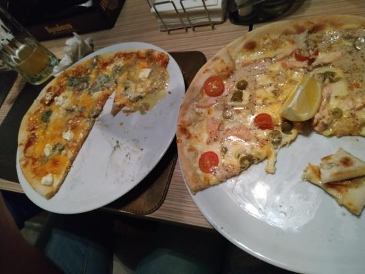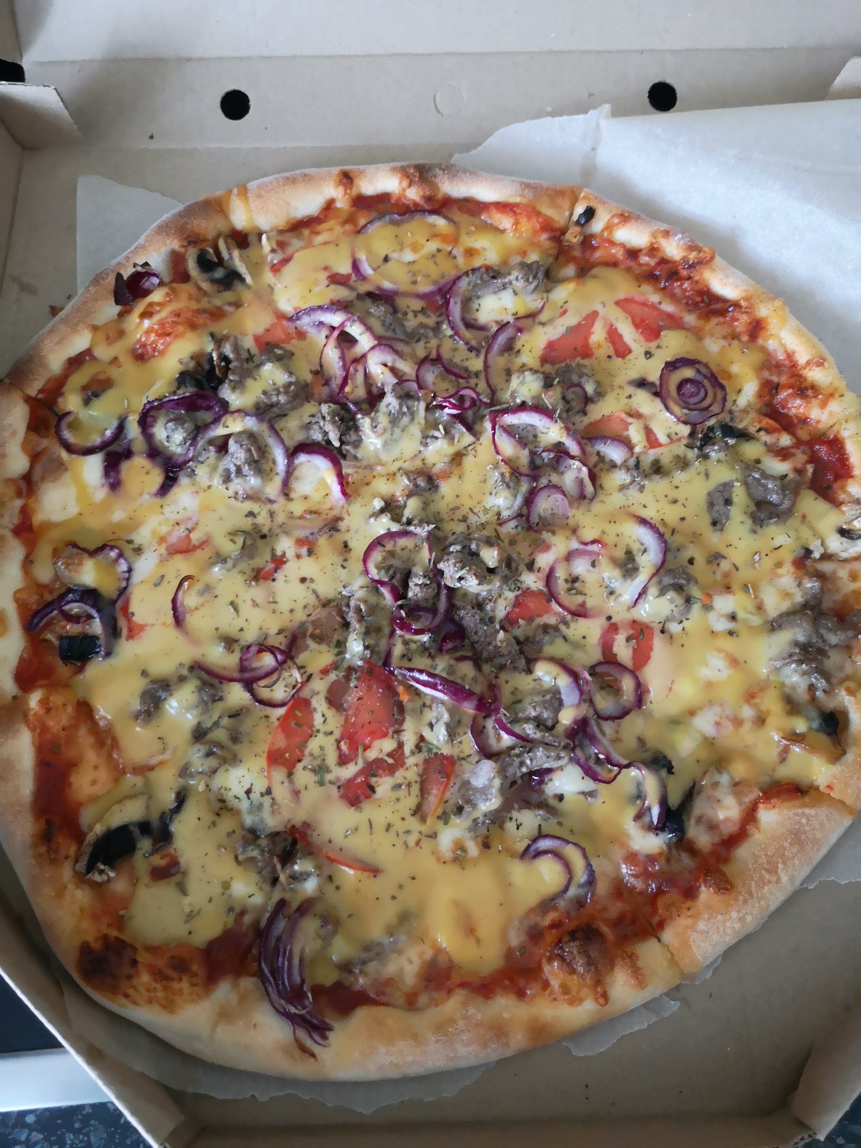 Состав: тесто, соус сливочный, моцарелла, тунец консервированный, оливки, лимон, специи