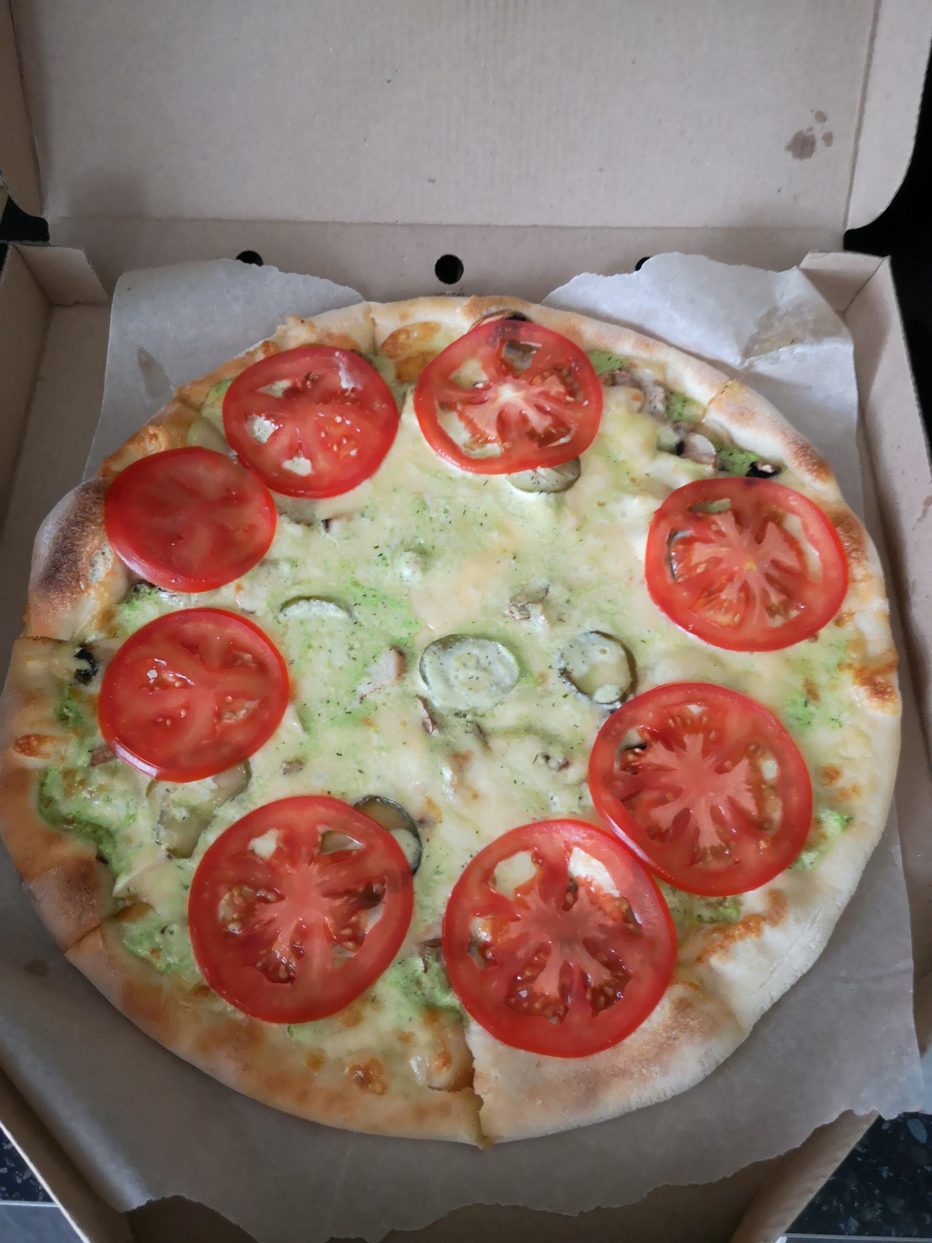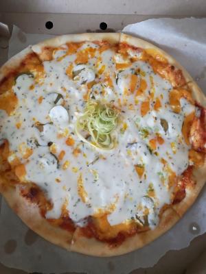 Состав: тесто, помидорная смесь, моцарелла, курица, цукини, шампиньоны, соус карри, масло чесночное, специи