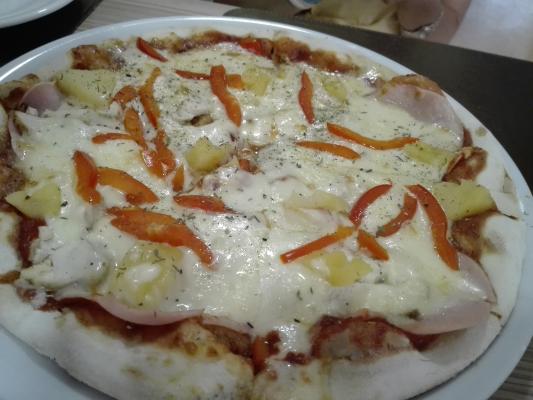 Состав: тесто, помидорная смесь, моцарелла, курица, ветчина, консервированные ананас, перец сладкий, специи