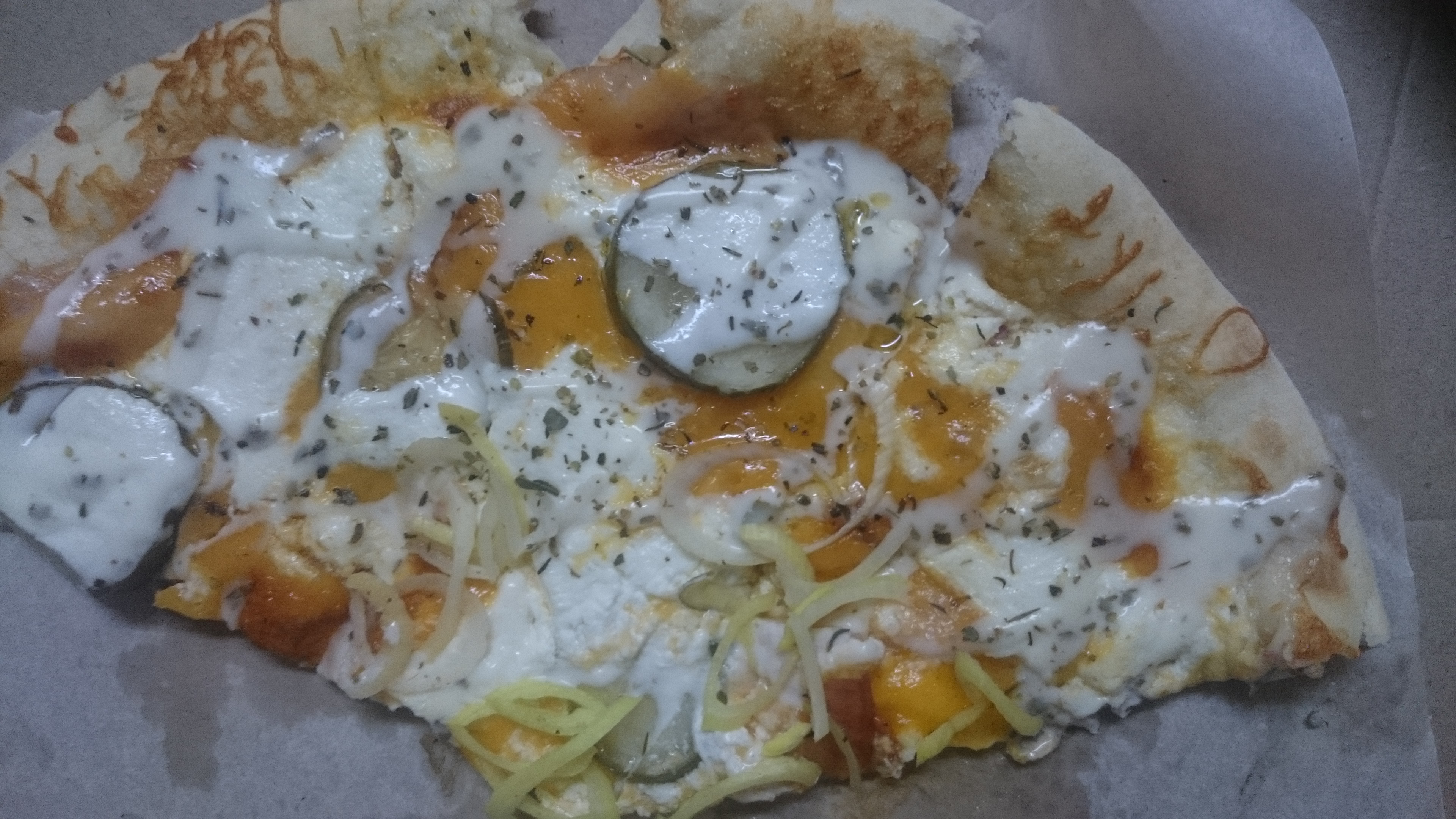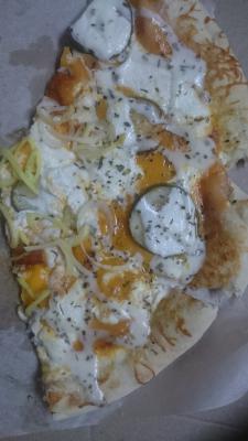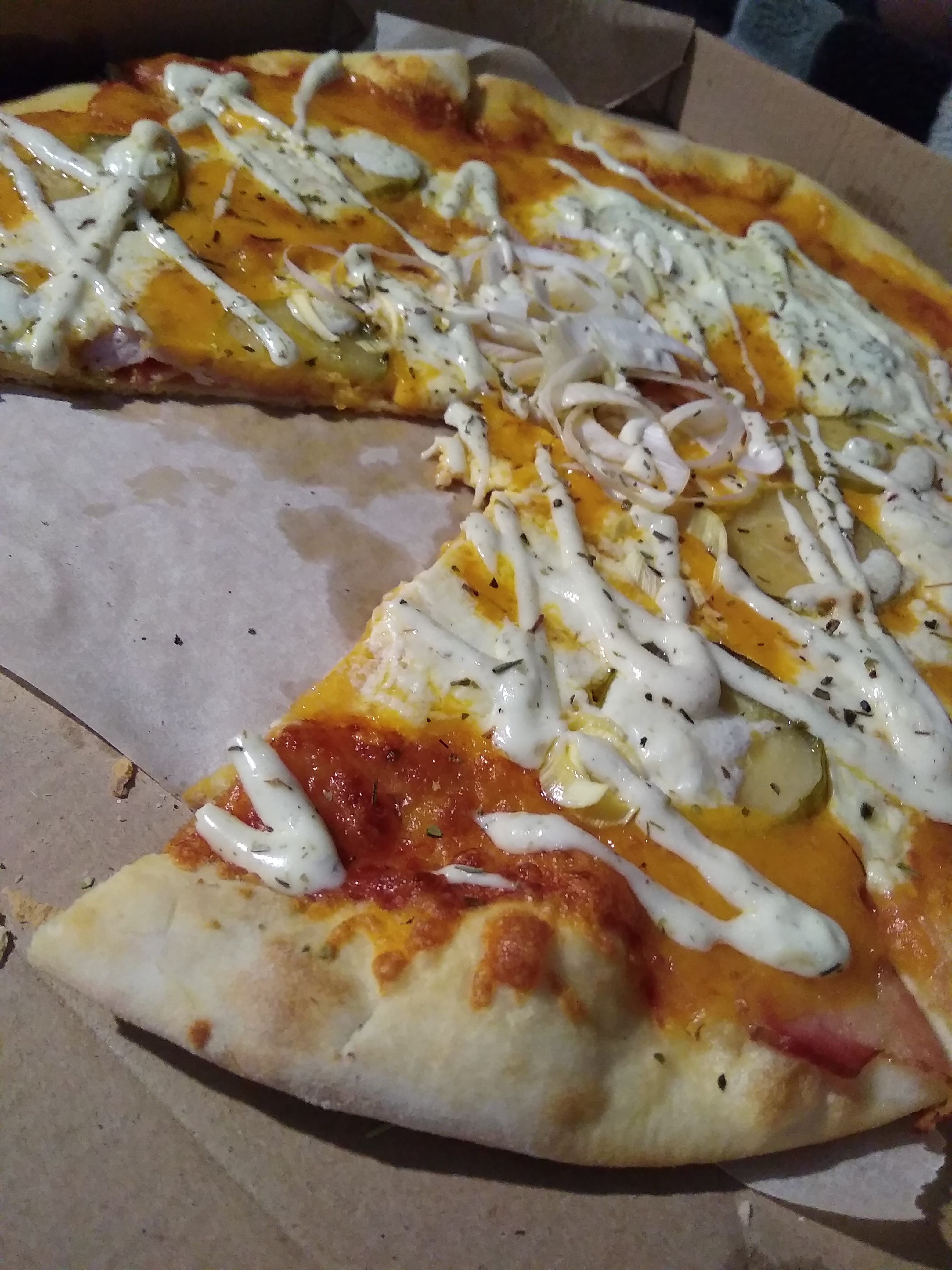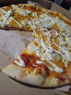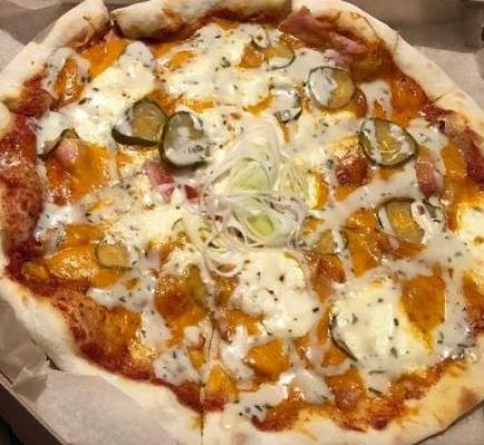 Состав: тесто, помидорная смесь, сыр чеддер, бекон, балык, огурцы маринованные, соус рикотта, соус чесночный, порей