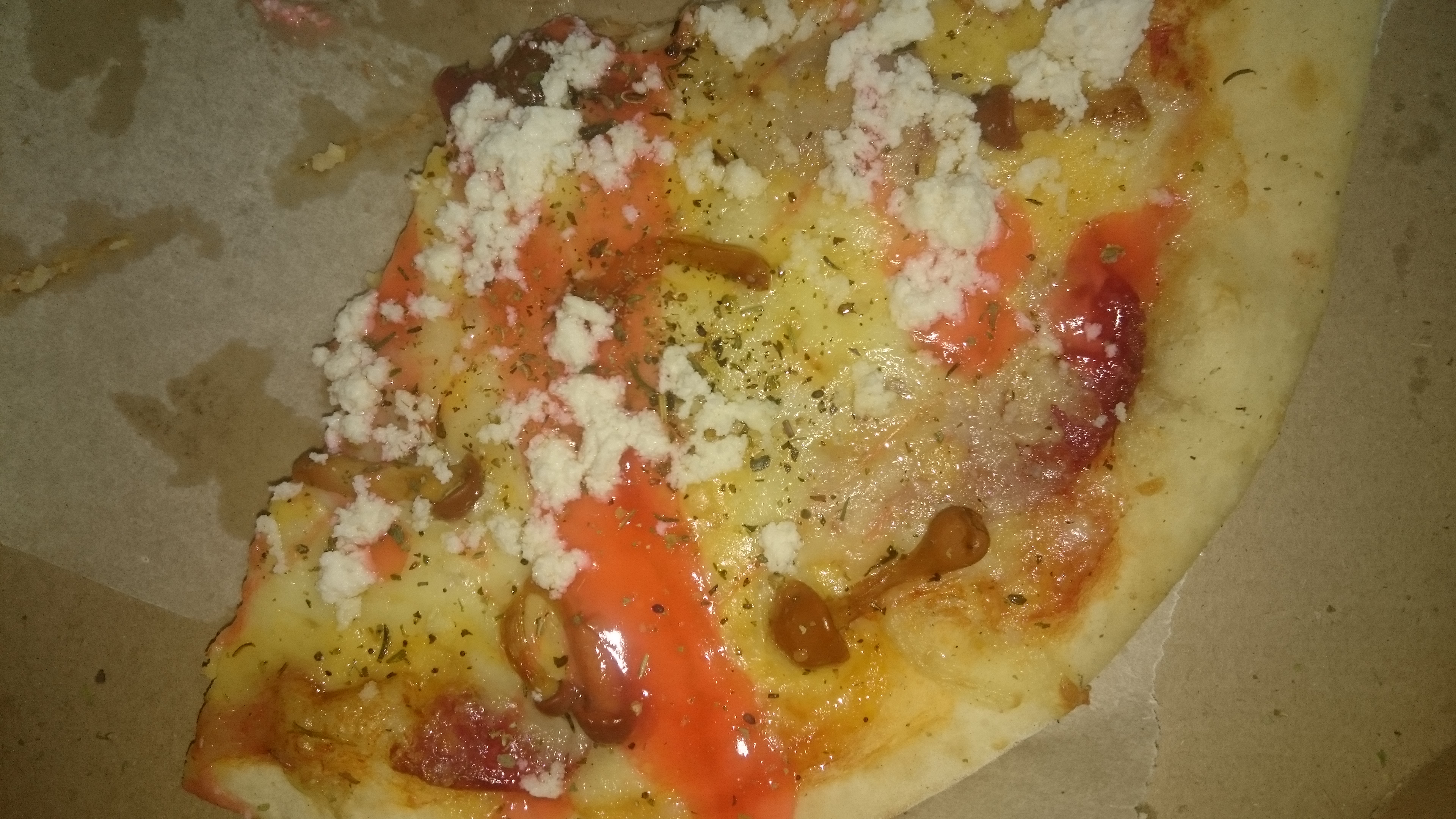 Состав: тесто, помидорная смесь, моцарелла, сыр рикотта, колбаски охотничьи, колбаса с/к, опята, соус острый, масло чесночное, специи
