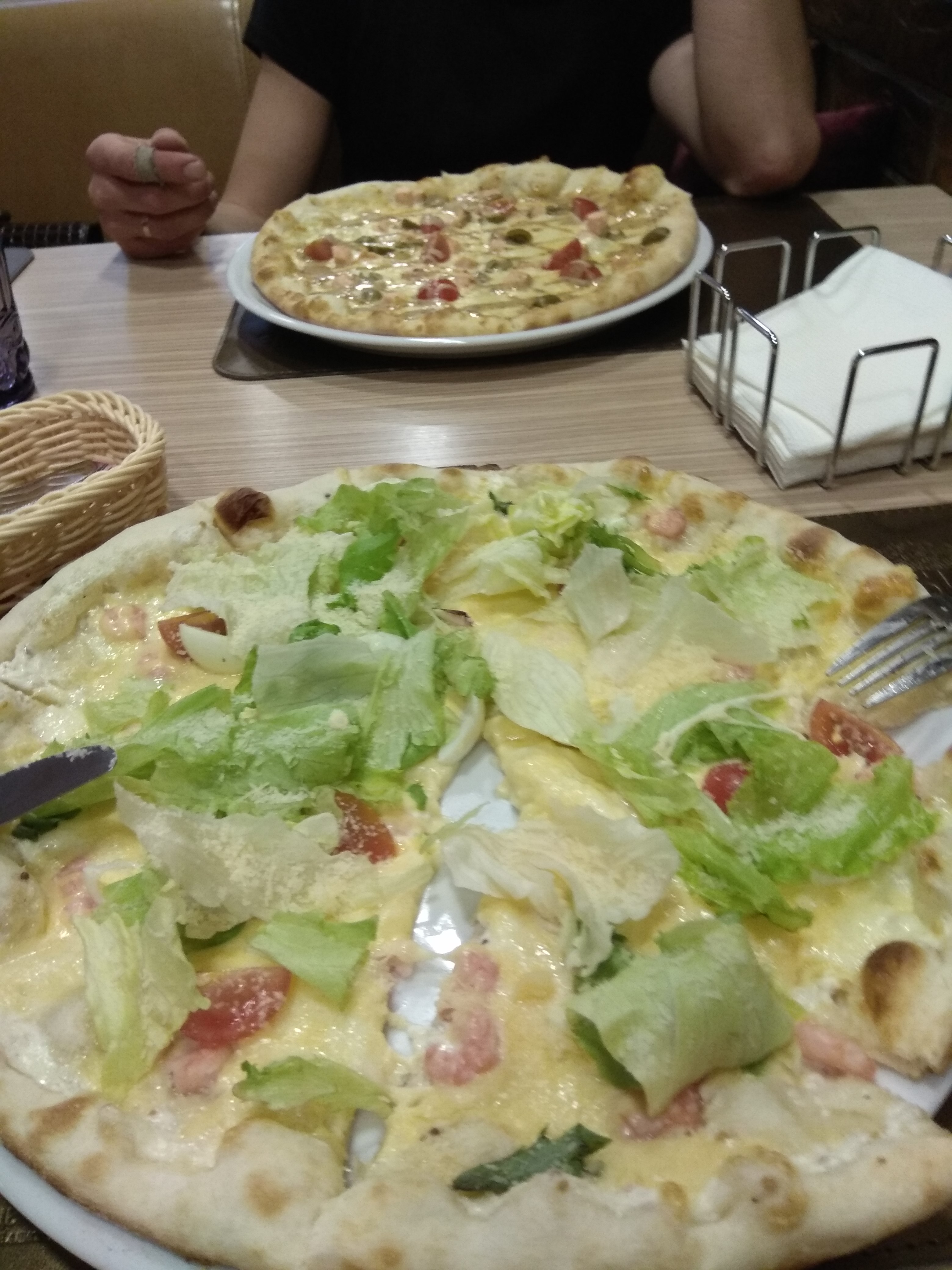 Состав: тесто, соус цезарь, моцарелла, креветки, яйцо перепелиное, томаты черри, салат, сыр джюгас