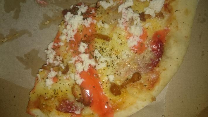 Состав: тесто, помидорная смесь, моцарелла, сыр фета, бекон, брокколи, кукуруза, соус чесночный, специи