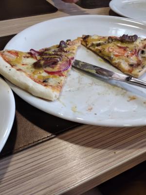Состав: тесто, помидорная смесь, ветчина, салями, моцарелла, маслины, специи