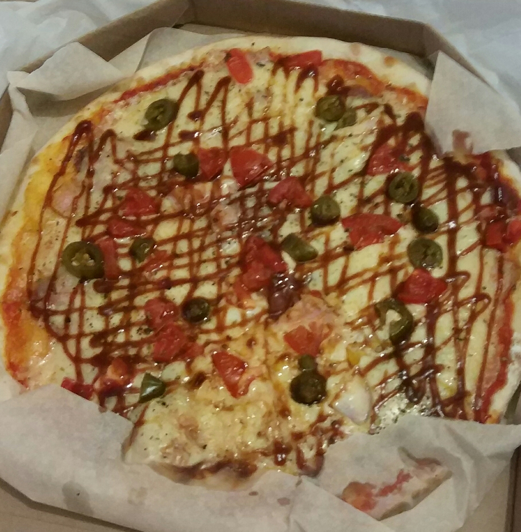 Состав: тесто, помидорная смесь, моцарелла, колбаса с/к, перец халапеньо, специи