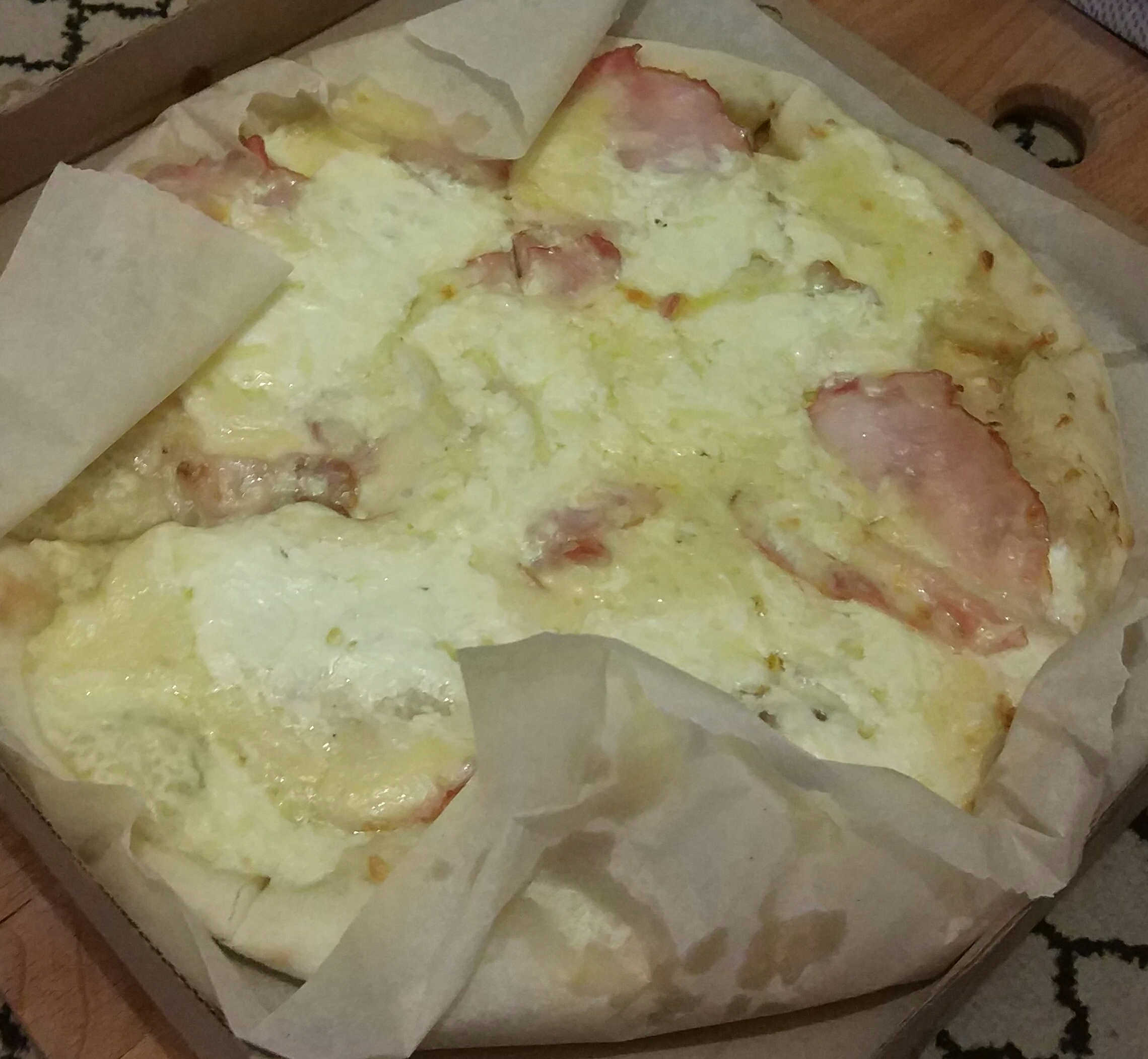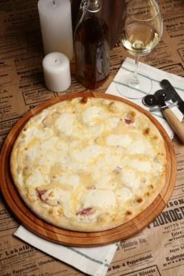 Состав: тесто, соус карбонара, моцарелла, бекон, балык