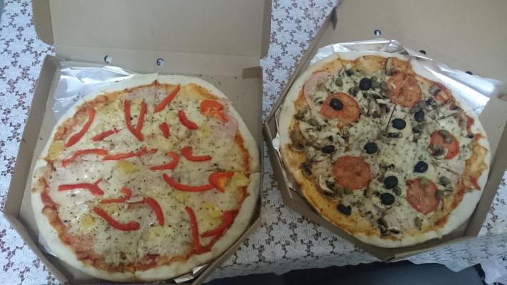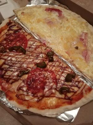 Состав: тесто, помидорная смесь, ветчина, салями, моцарелла, маслины, специи