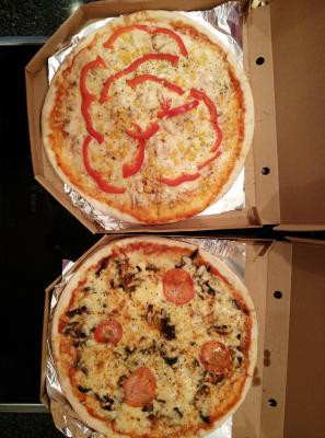 Состав: тесто, помидорная смесь, моцарелла, курица, цукини, шампиньоны, соус карри, масло чесночное, специи