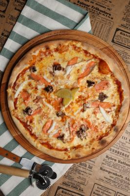 Состав: тесто, помидорная смесь, моцарелла, морской коктейль, лосось, лимон, специи