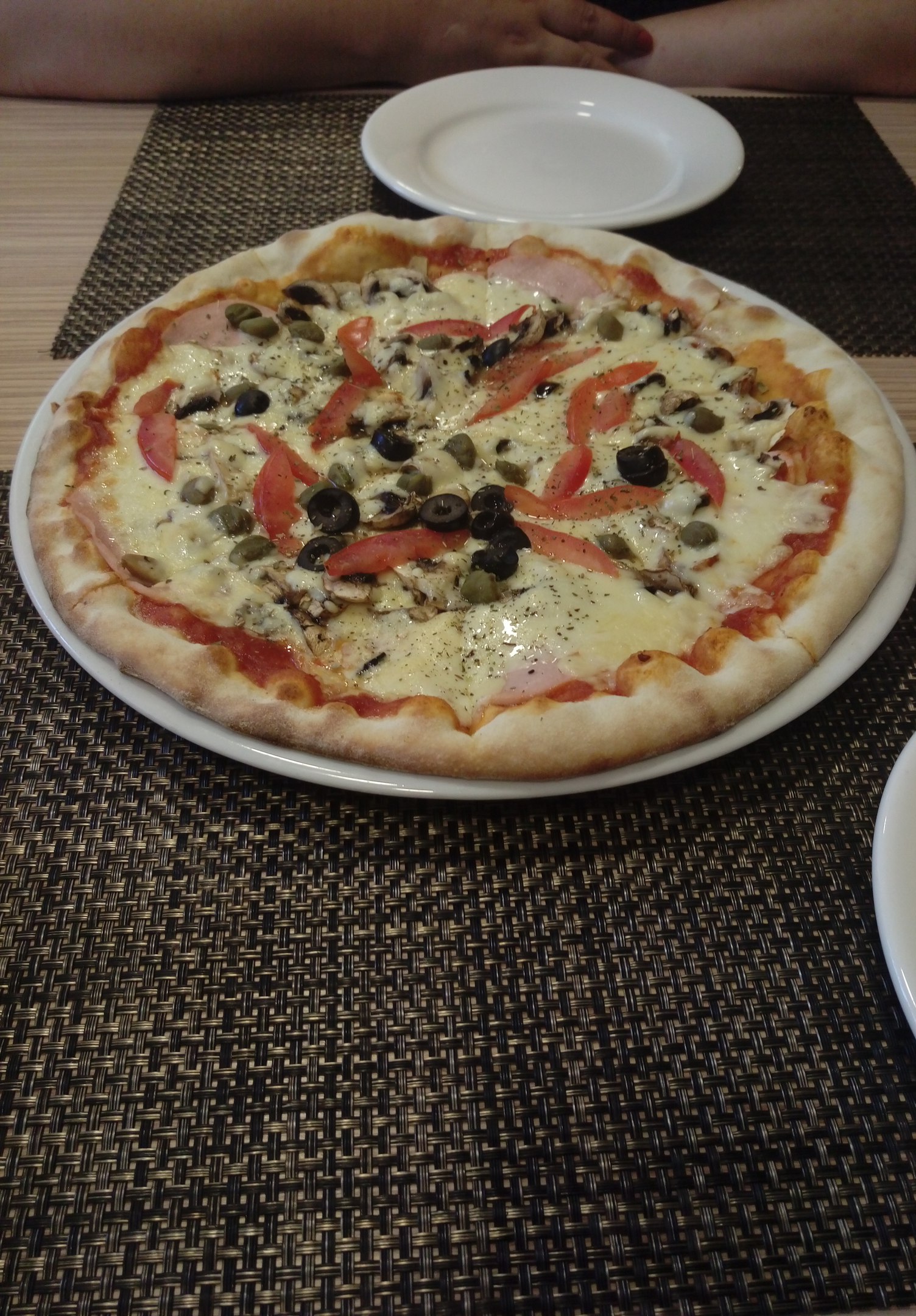 Состав: тесто, помидорная смесь, ветчина, салями, моцарелла, маслины, специи