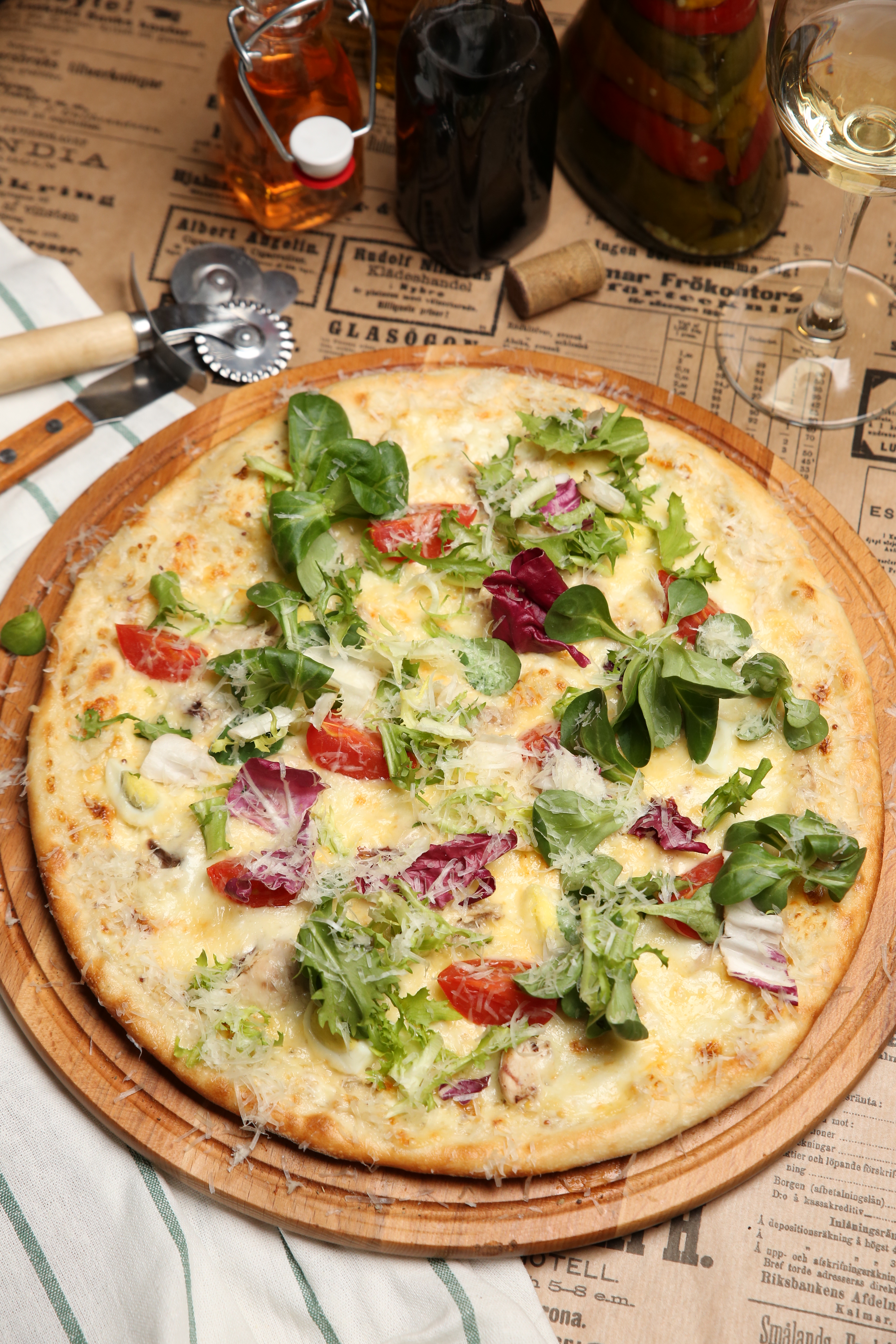 Состав: тесто, соус сливочный, моцарелла, лосось, томаты черри, оливки