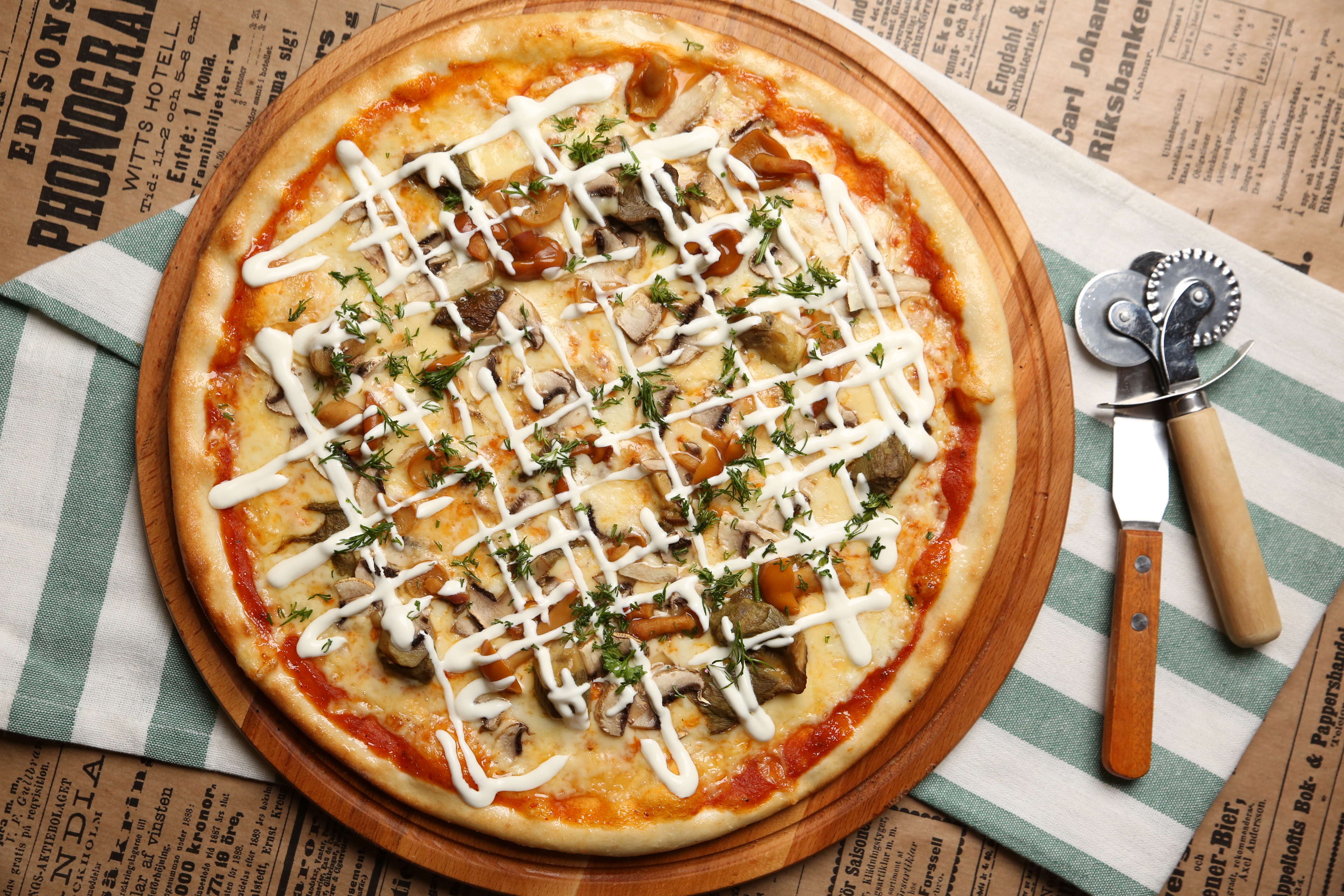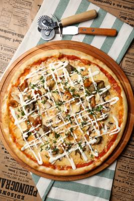 Состав: тесто, помидорная смесь, моцарелла, белые грибы, опята рыжие, шампиньоны, соус грибной, сметана, зелень