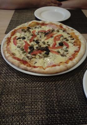Состав: тесто, помидорная смесь, моцарелла, ветчина, шампиньоны, маслины, каперсы, томаты, специи